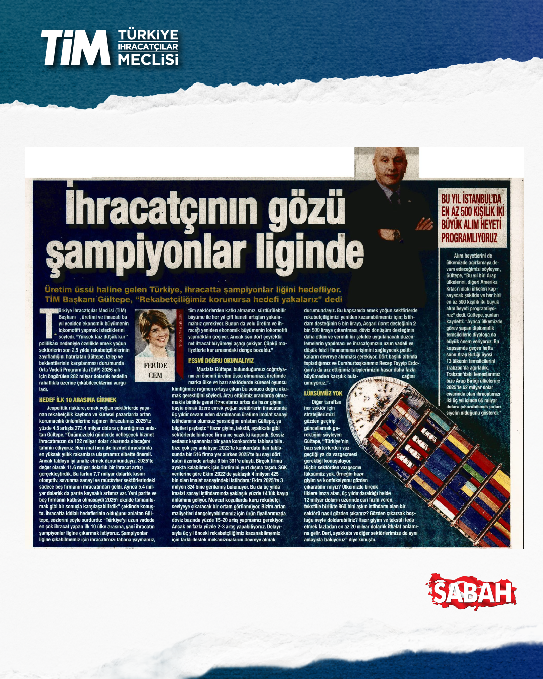 TİM Başkanı Mustafa Gültepe, Türkiye'nin 2025 yılı ihracat performansını ve 2026 yılına ilişkin beklentilerini değerlendirdi. 2025 yılının özellikle emek yoğun sektörler açısından zorlu geçtiğine dikkat çeken Gültepe, buna rağmen ihracatın yüzde 4,5 artışla 273,4 milyar dolara ulaştığını belirtti. Gültepe, “2026'da çok daha güçlü bir performans sergileyebilir, mal ihracatında OVP'de öngörülen 282 milyar doların üzerine çıkabiliriz.” dedi.