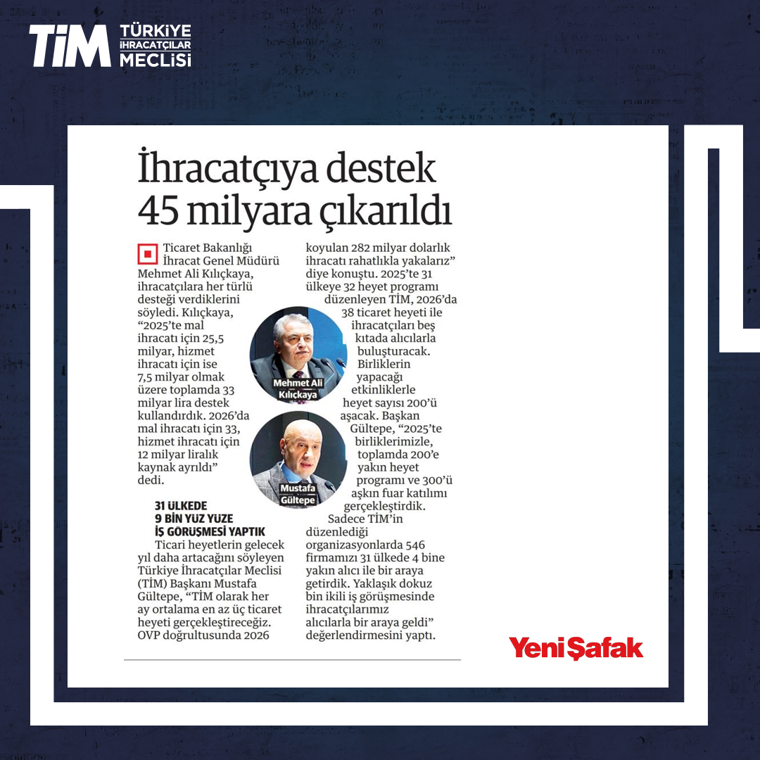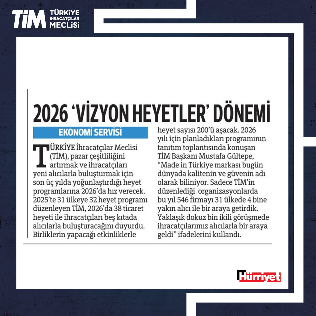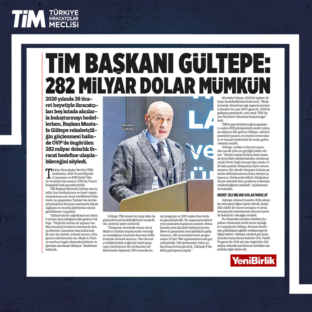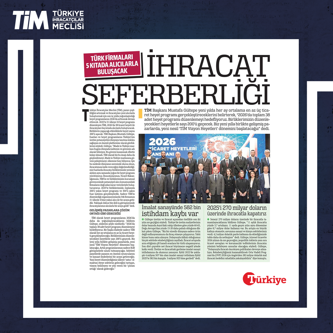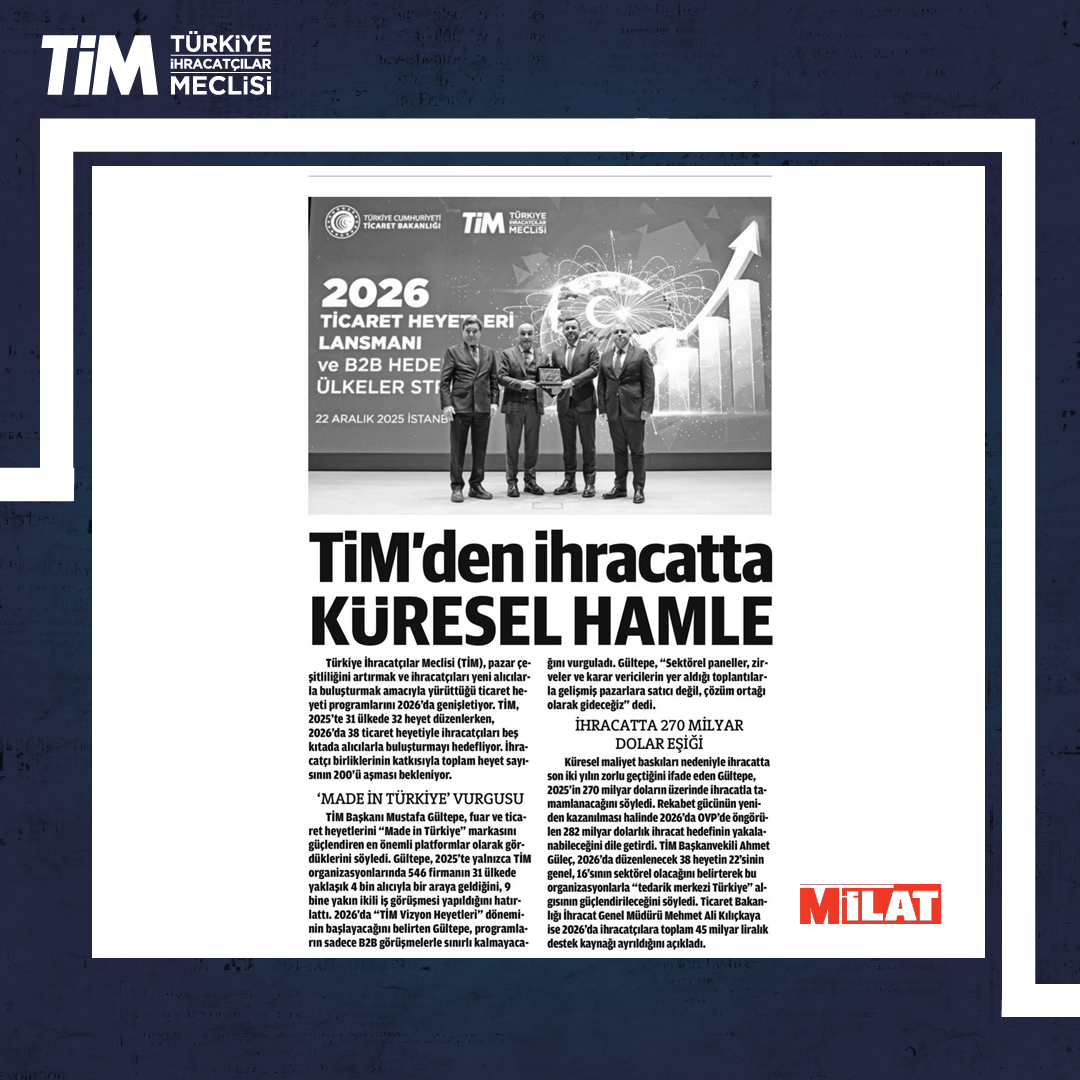 TİM, "2026 Ticaret Heyetleri Lansmanı ve B2B Hedef Ülkeler Stratejisi” programını, İstanbul Dış Ticaret Kompleksi'nde gerçekleştirdi. Programın açılışında konuşan TİM Başkanı Mustafa Gültepe, fuarları ve heyet programlarını Türkiye'nin üretim potansiyelini dünyaya tanıtma imkânı sağlayan en önemli platformlar olarak gördüklerini söyledi. Gültepe, "Her ay ortalama en az üç ticaret heyeti gerçekleştireceğiz. 2026 ile birlikte gelişmiş pazarlarda, yeni nesil 'TİM Vizyon Heyetleri' dönemini başlatacağız." dedi.
