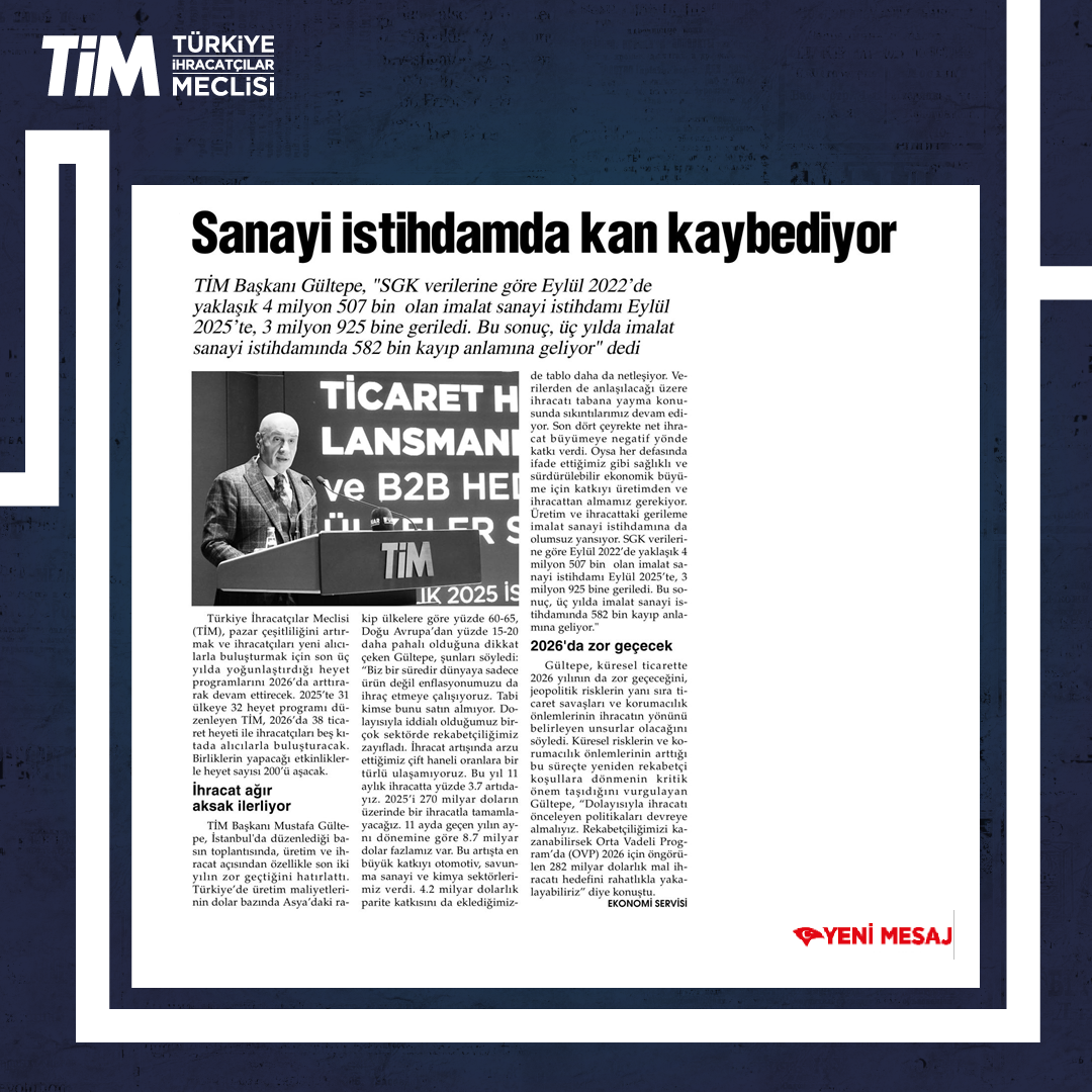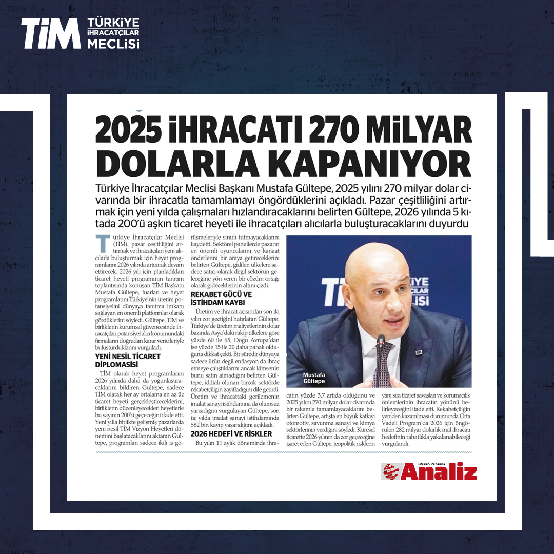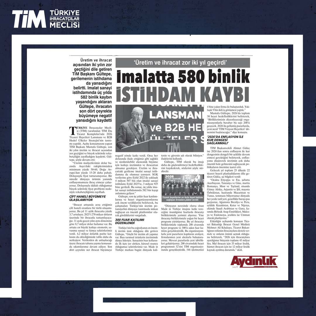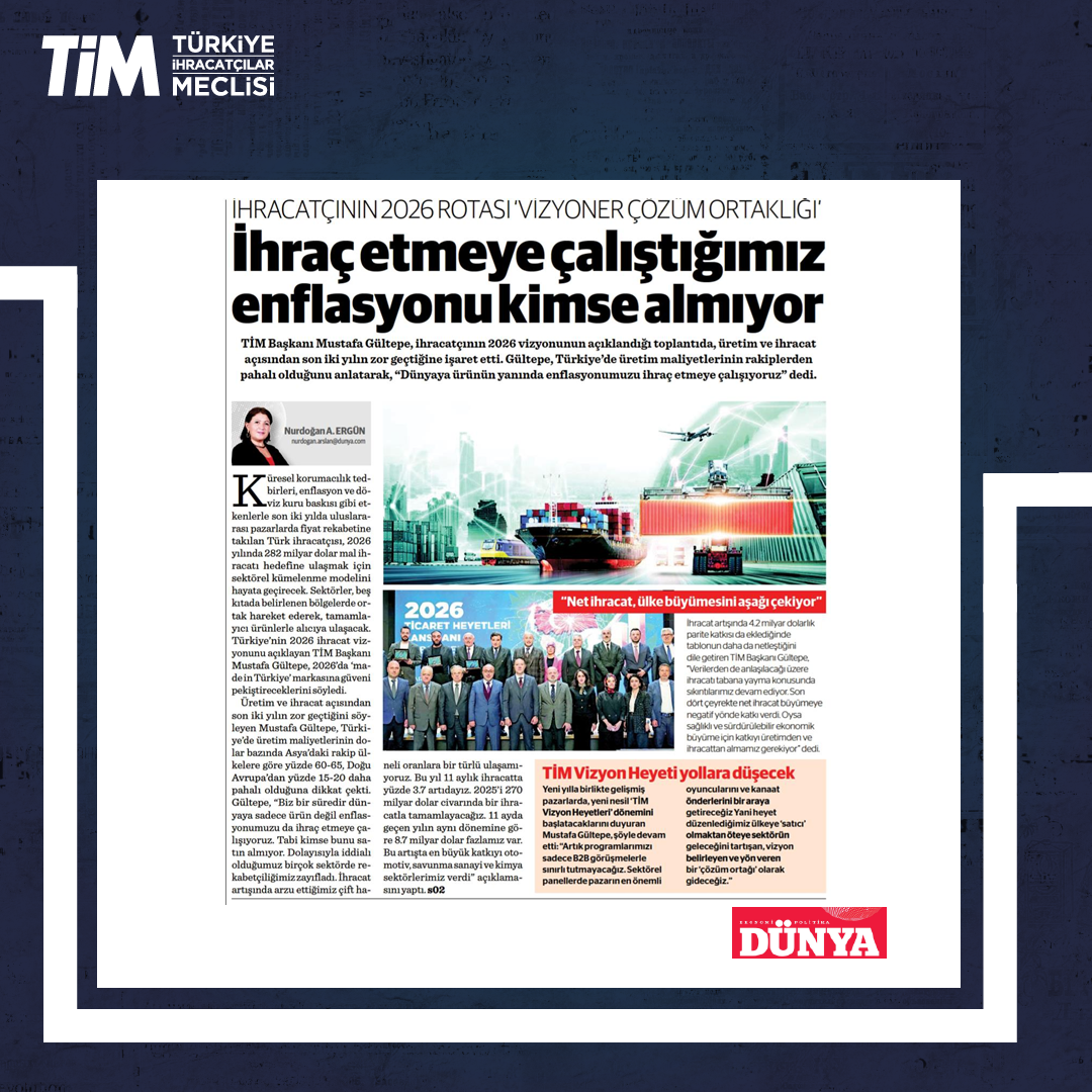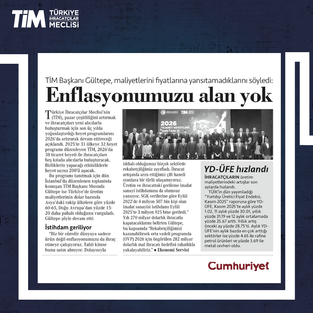 TİM, "2026 Ticaret Heyetleri Lansmanı ve B2B Hedef Ülkeler Stratejisi” programını, İstanbul Dış Ticaret Kompleksi'nde gerçekleştirdi. Programın açılışında konuşan TİM Başkanı Mustafa Gültepe, fuarları ve heyet programlarını Türkiye'nin üretim potansiyelini dünyaya tanıtma imkânı sağlayan en önemli platformlar olarak gördüklerini söyledi. Gültepe, "Her ay ortalama en az üç ticaret heyeti gerçekleştireceğiz. 2026 ile birlikte gelişmiş pazarlarda, yeni nesil 'TİM Vizyon Heyetleri' dönemini başlatacağız." dedi.