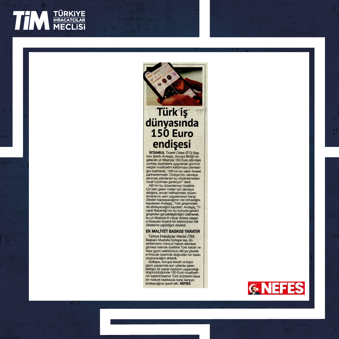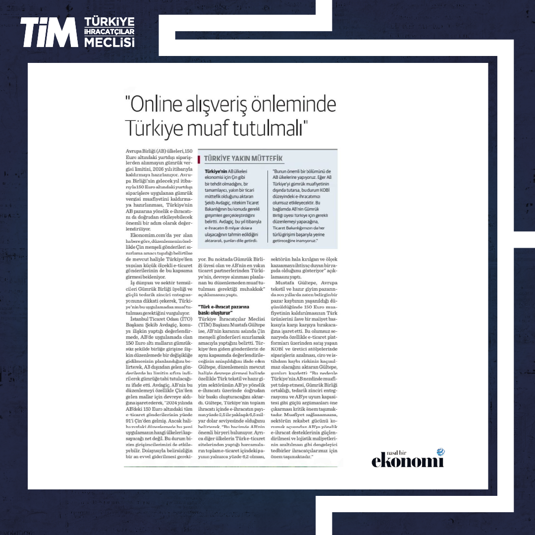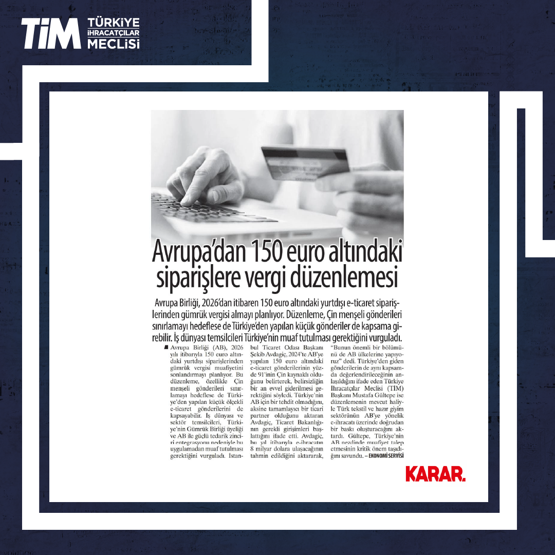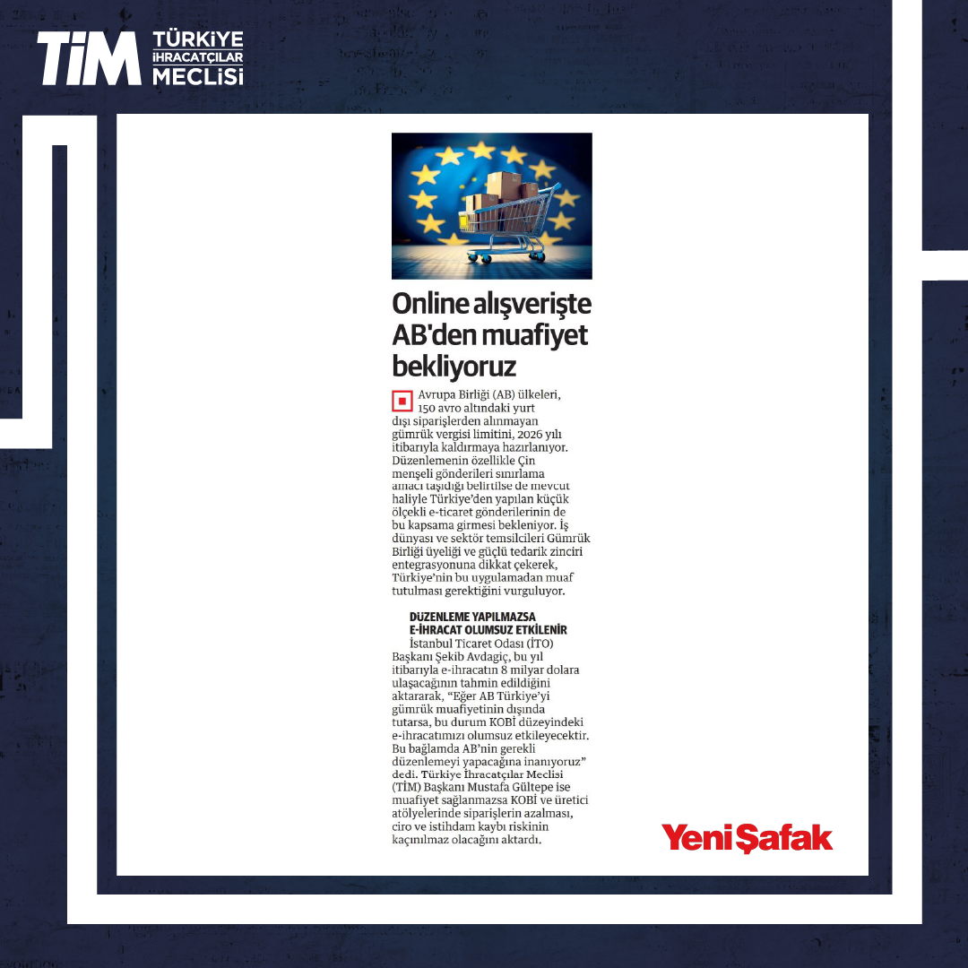 Avrupa Birliği (AB) ülkeleri, 150 euro altındaki yurtdışı siparişlerden alınmayan gümrük vergisi limitini, 2026 yılı itibarıyla kaldırmaya hazırlanıyor. Düzenlemenin özellikle Çin menşeli gönderileri sınırlama amacı taşıdığı belirtilse de mevcut haliyle Türkiye'den yapılan küçük ölçekli e-ticaret gönderilerinin de bu kapsama girmesi bekleniyor. TİM Başkanı Mustafa Gültepe, konuya ilişkin yaptığı değerlendirmede, AB'nin muafiyeti kaldırma kararının Türk tekstil ve hazır giyim sektörünü baskı altına alabileceğini belirtti. Gültepe, “Bu nedenle Türkiye'nin AB nezdinde muafiyet talep etmesi, Gümrük Birliği ortaklığı, tedarik zinciri entegrasyonu ve AB'ye uyum kapasitesi gibi güçlü argümanları öne çıkarması kritik önem taşımaktadır.” dedi.