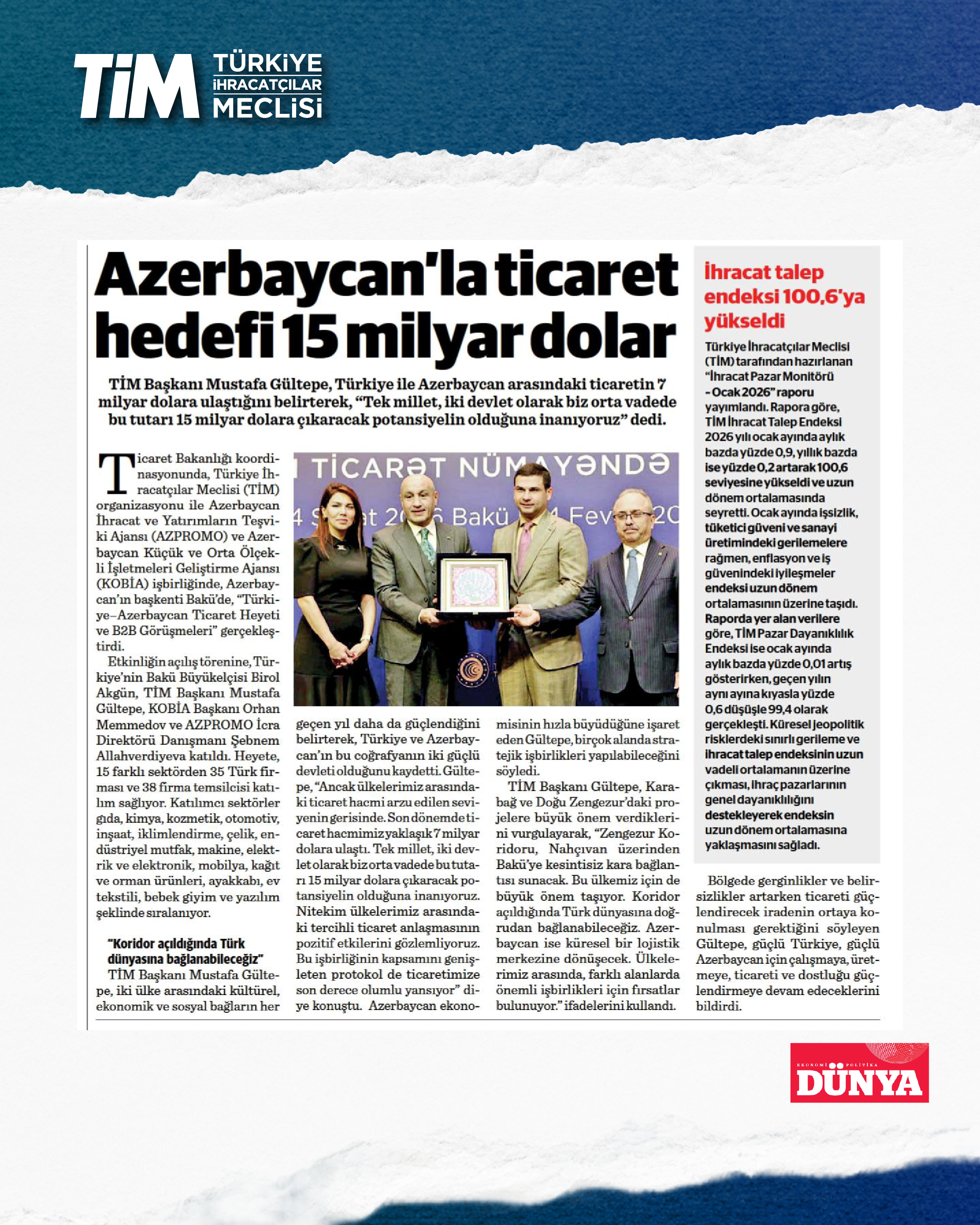 Türkiye İhracatçılar Meclisi (TİM), Azerbaycan İhracat ve Yatırımların Teşviki Ajansı (AZPROMO) ve Azerbaycan Küçük ve Orta Ölçekli İşletmeleri Geliştirme Ajansı (KOBİA) iş birliğinde, Azerbaycan'ın başkenti Bakü'de, "Türkiye–Azerbaycan Ticaret Heyeti ve B2B Görüşmeleri" gerçekleştiriliyor. Programın açılışında konuşan TİM Başkanı Mustafa Gültepe, iki ülke arasındaki ticaret hacminin arzu edilen seviyenin gerisinde olduğunu belirtti. Gültepe, “Son dönemde ticaret hacmimiz yaklaşık 7 milyar dolara ulaştı. Tek millet, iki devlet olarak biz orta vadede bu tutarı 15 milyar dolara çıkaracak potansiyelin olduğuna inanıyoruz.” dedi.