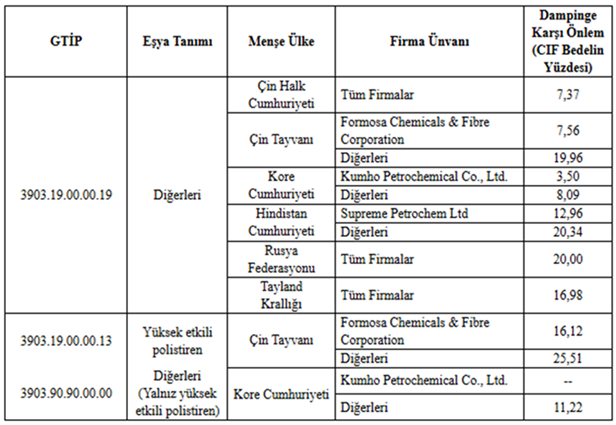 ​İthalatta Haksız Rekabetin Önlenmesine İlişkin Tebliğ (No: 2025/37) ile Çin, Çin Tayvanı, Hindistan, Güney Kore, Rusya ve Tayland menşeli polistiren ürünlerine yönelik damping soruşturması tamamlanarak sonuçlar yayımlandı.