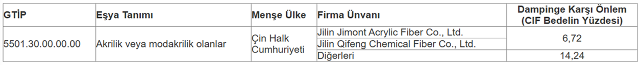 İthalatta Haksız Rekabetin Önlenmesine İlişkin Tebliğ (Tebliğ No: 2025/39) ile Ticaret Bakanlığı tarafından yürütülen damping soruşturması tamamlanarak, Çin Halk Cumhuriyeti menşeli "akrilik elyaf" ithalatına yönelik kesin önlem kararı alındı.