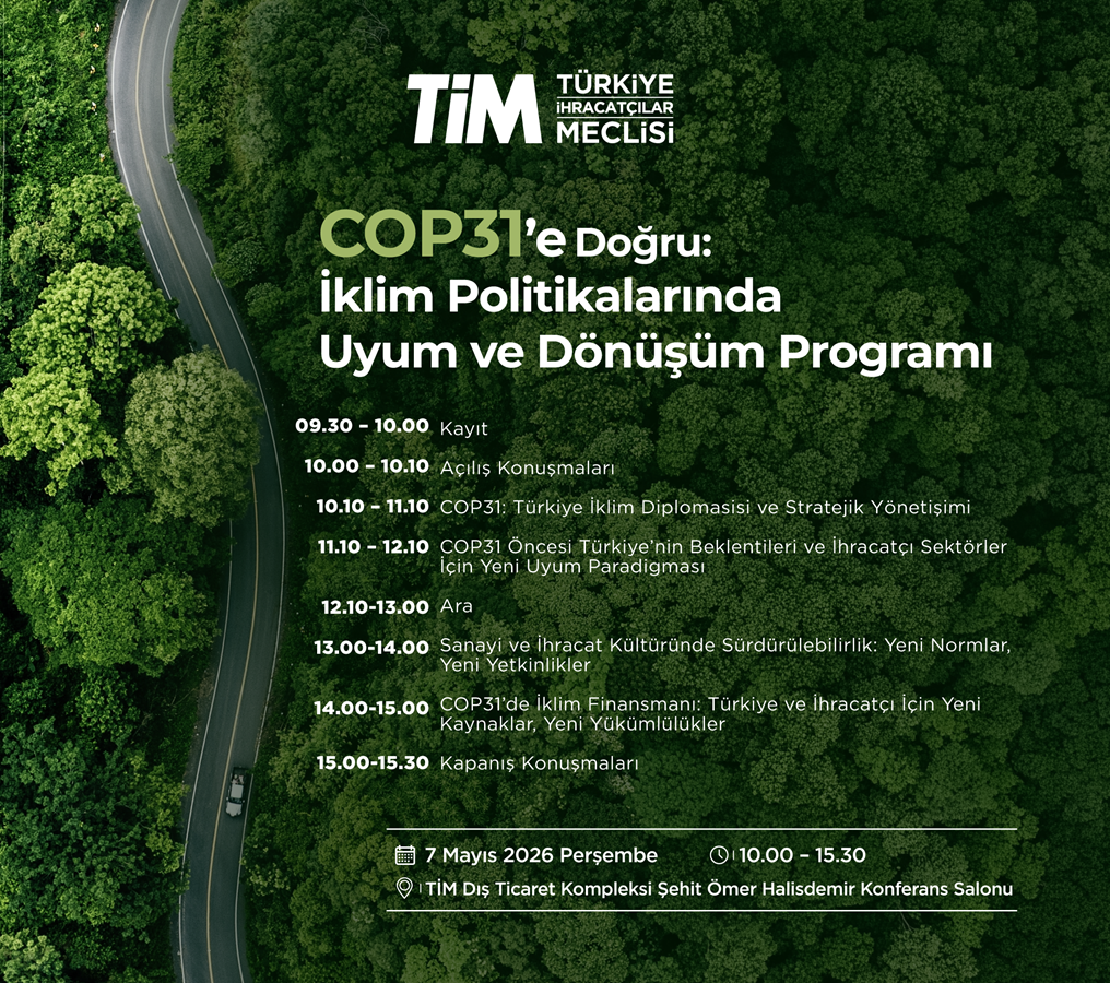 Kamu, özel sektör ve uluslararası kuruluş temsilcilerini bir araya getiren “COP31'e Doğru: İklim Politikalarında Uyum ve Dönüşüm Programı”, 7 Mayıs 2026 tarihinde Türkiye İhracatçılar Meclisi Dış Ticaret Kompleksi Şehit Ömer Halisdemir Konferans Salonu'nda gerçekleştirilecektir.