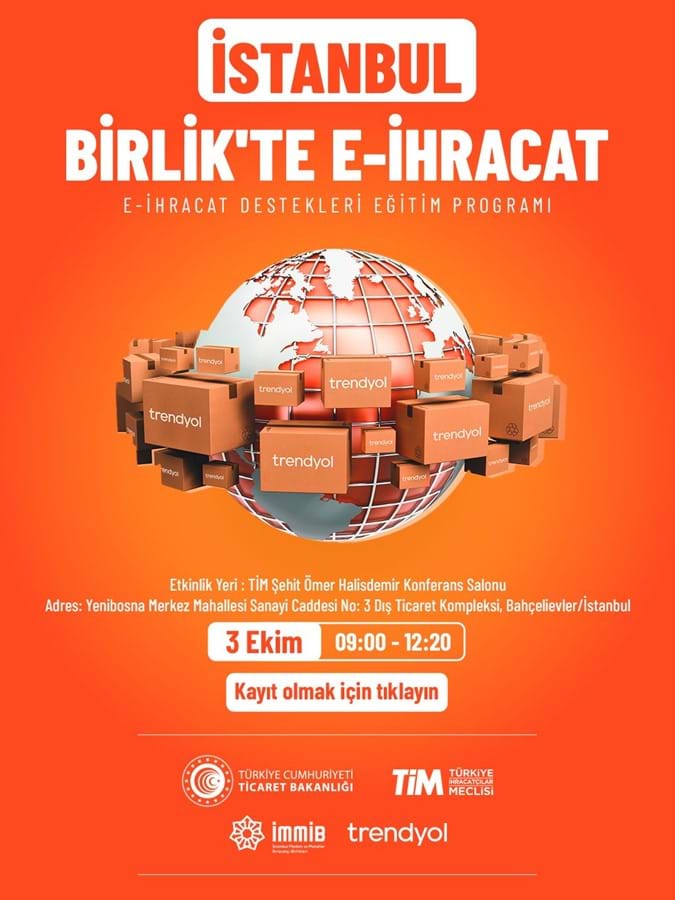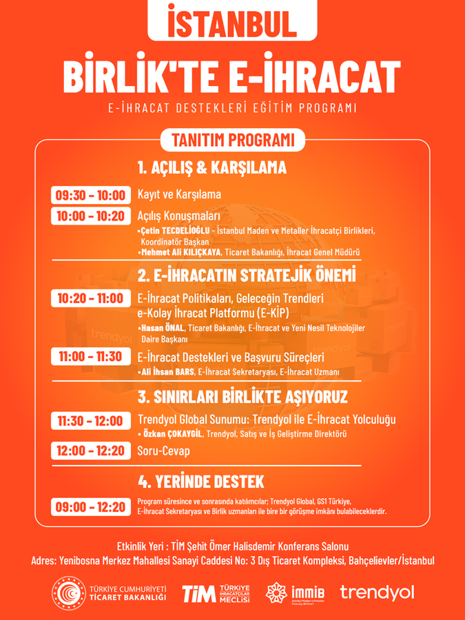 E-ihracat ekosisteminde daha fazla firmamızın devlet desteklerinden yararlanabilmesi için Ticaret Bakanlığı, Türkiye İhracatçılar Meclisi (TİM) ve Trendyol iş birliğiyle hayata geçirilen eğitim programlarının altıncısı İstanbul Maden ve Metaller İhracatçı Birlikleri (İMMİB) ev sahipliğinde İstanbul'da gerçekleştirilecektir.