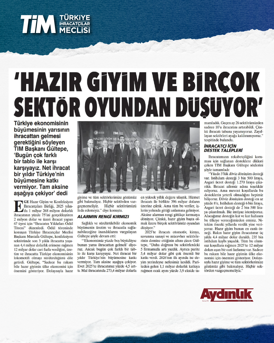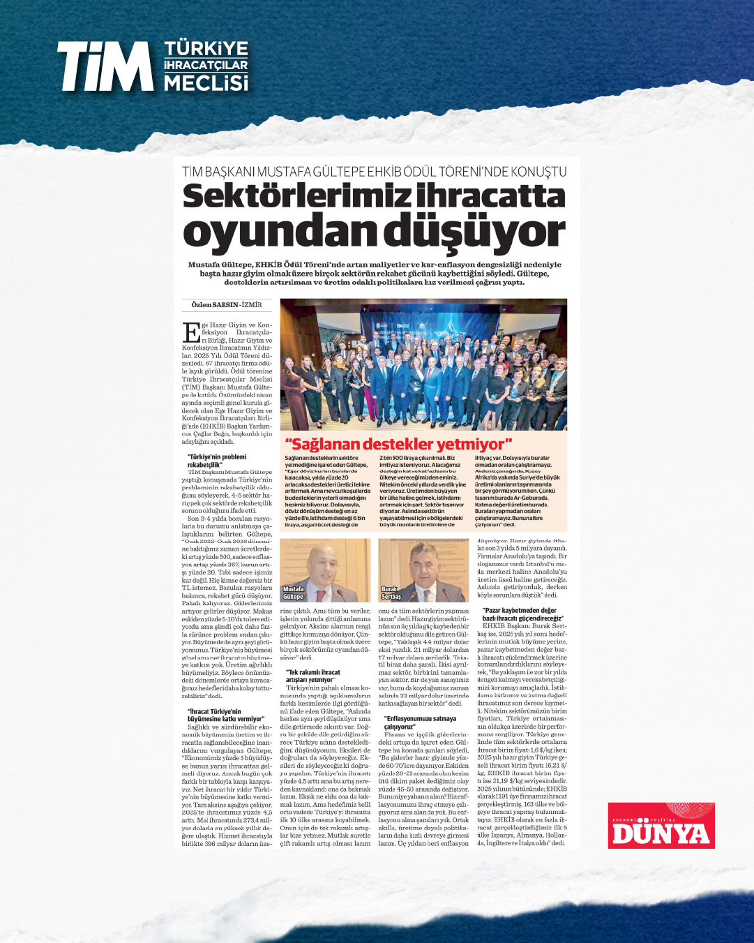 Ege Hazır Giyim ve Kon­feksiyon İhracatçıla­rı Birliği, Hazır Giyim ve Konfeksiyon İhracatının Yıldız­ları 2025 Yılı Ödül Töreni dü­zenledi. 67 ihracatçı firma ödü­le layık görüldü. Ödül töreninde konuşan TİM Başkanı Mustafa Gültepe, artan maliyetler ve kur-enflasyon dengesizliği nedeniyle başta hazır giyim olmak üzere birçok sektörün rekabet gücünü kaybettiğini söyledi. Gültepe, “Türkiye'nin büyümesi güzel ama net ihracatın büyüme­ye katkısı yok. Üretim ağırlıklı büyümeliyiz. Böylece önümüz­deki dönemlerde ortaya koyaca­ğımız hedefleri daha kolay tuttu­rabiliriz.” dedi.