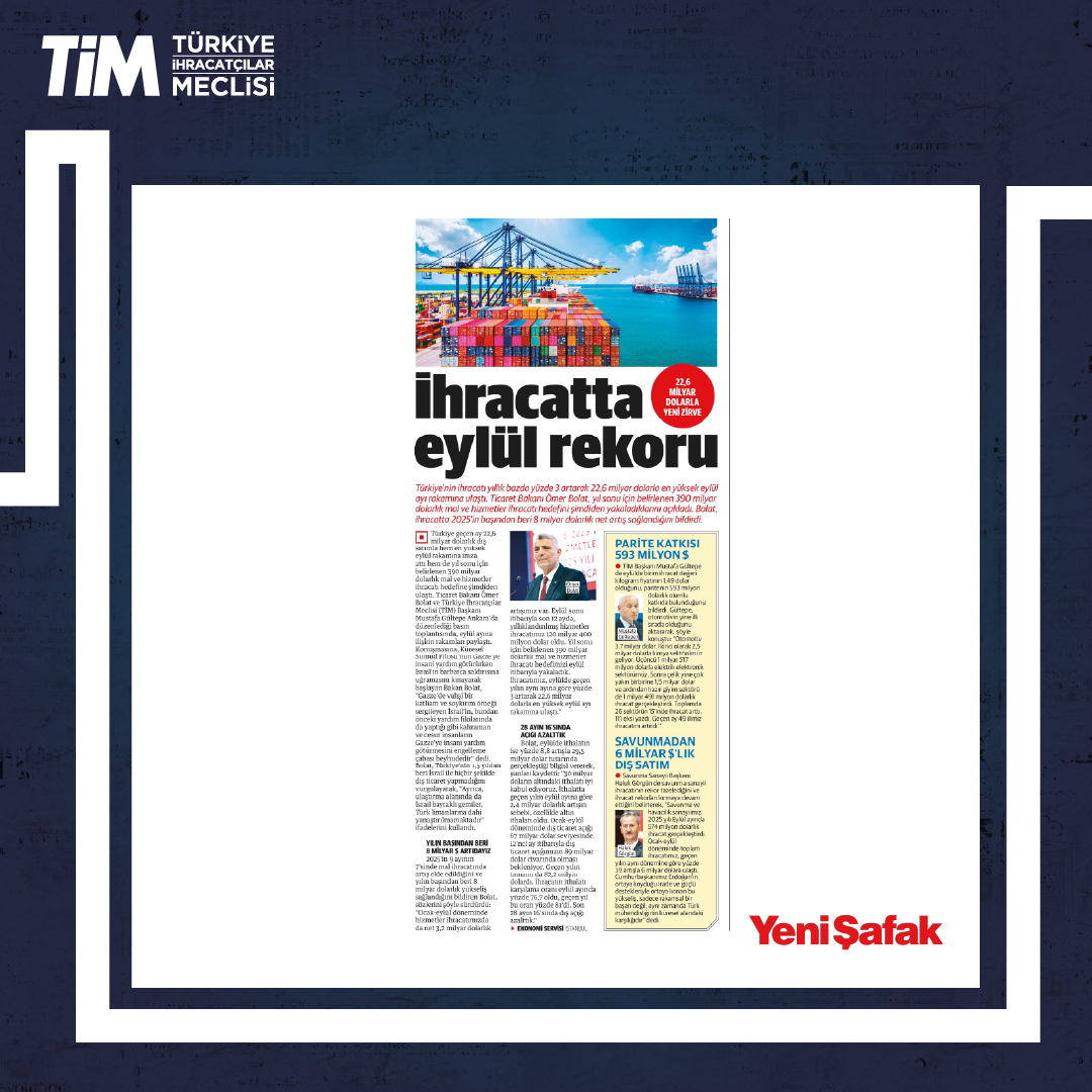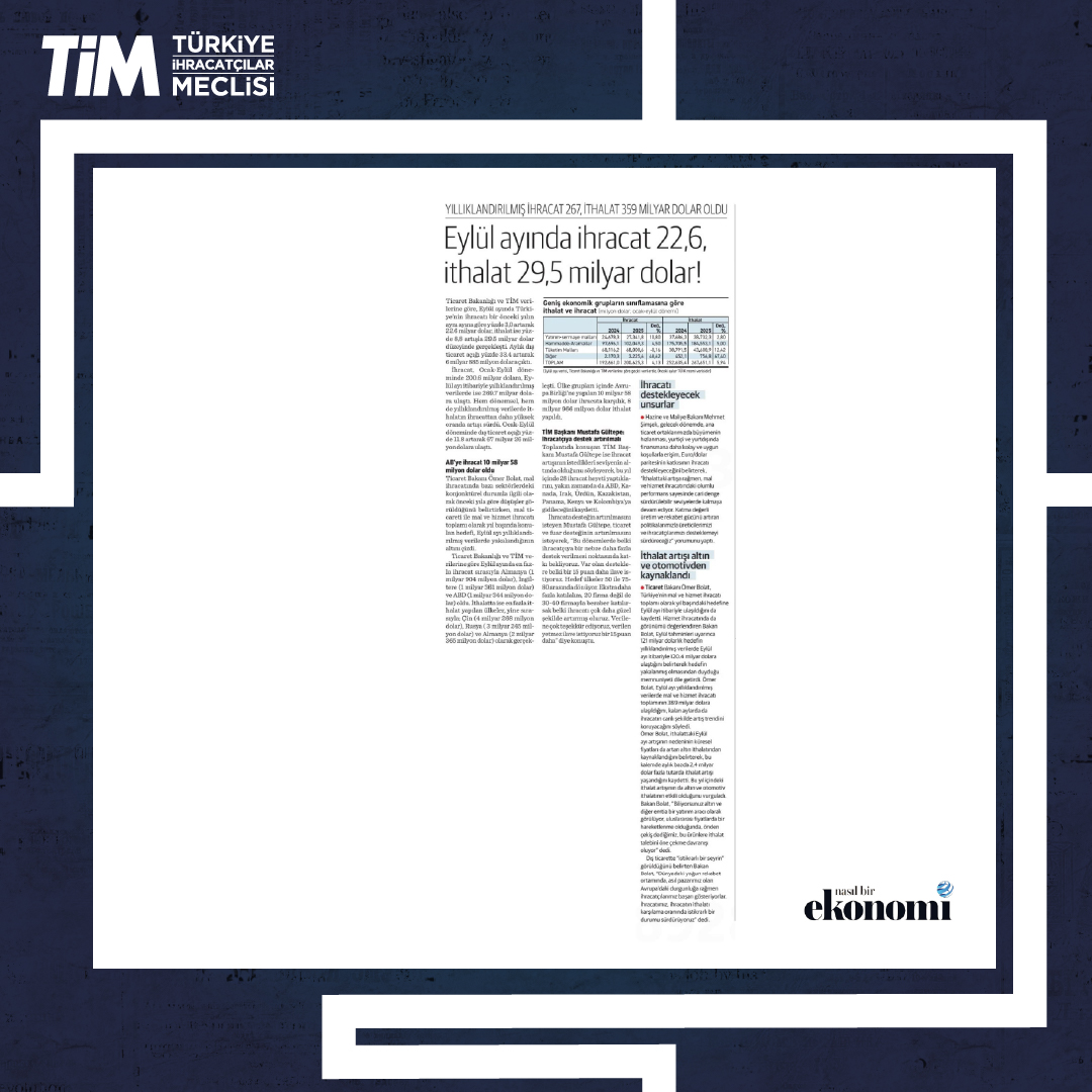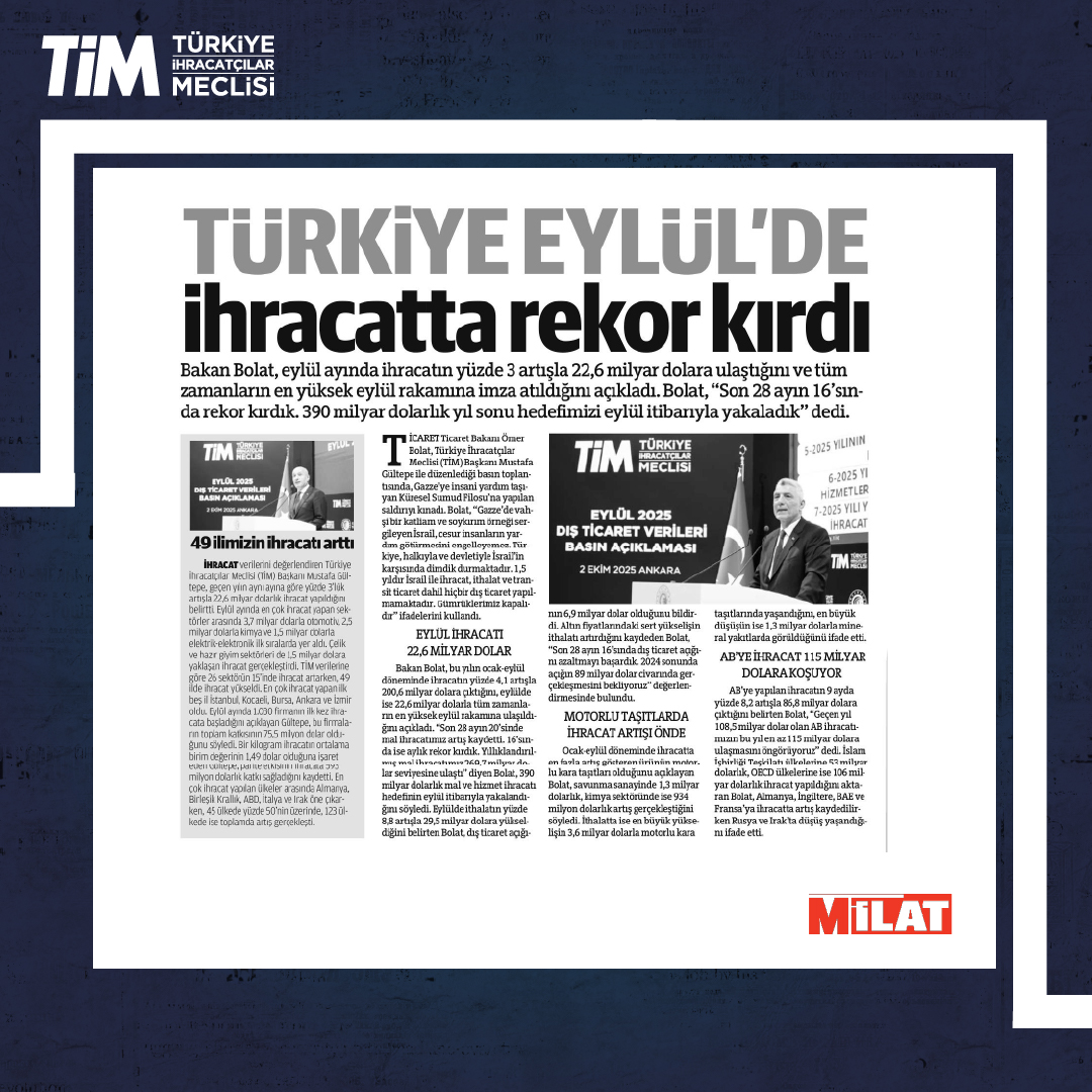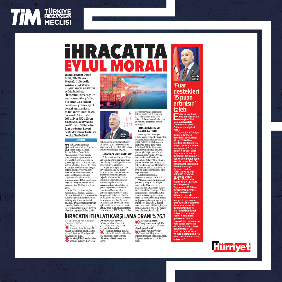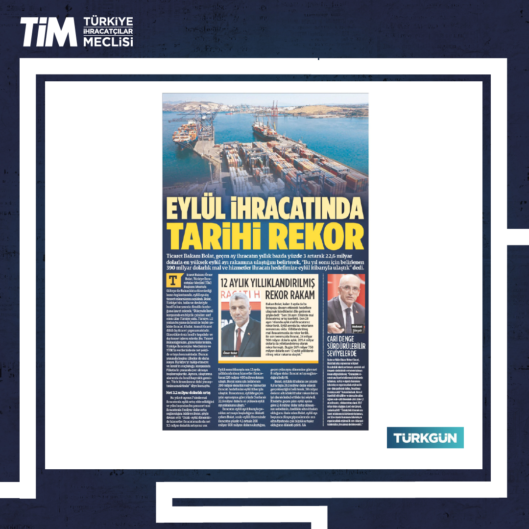 Eylül ayı ihracat verileri Ticaret Bakanı Prof. Dr. Ömer Bolat ve TİM Başkanı Mustafa Gültepe tarafından Ankara'da açıklandı. Türkiye'nin eylül ayı ihracatı 22,6 milyar dolar oldu. Ocak-Eylül döneminde dokuz aylık ihracat 200,6 milyar dolara, son 12 aylık ise 269,7 milyar dolara ulaştı. TİM Başkanı Mustafa Gültepe, ihracatı tabana yayma konusunda sıkıntıların devam ettiğine dikkat çekti. İhracatta sürdürülebilir büyüme için tüm sektörlerden katkı almak gerektiğini belirten Gültepe, “Ama biz her şeye rağmen elimizden gelenin en iyisini yapmak için çalışmaya, yeni pazar arayışına devam ediyoruz. Sektörel ticaret heyetleri ve fuarla 30 ülkeye ziyaret gerçekleştireceğiz.” dedi.