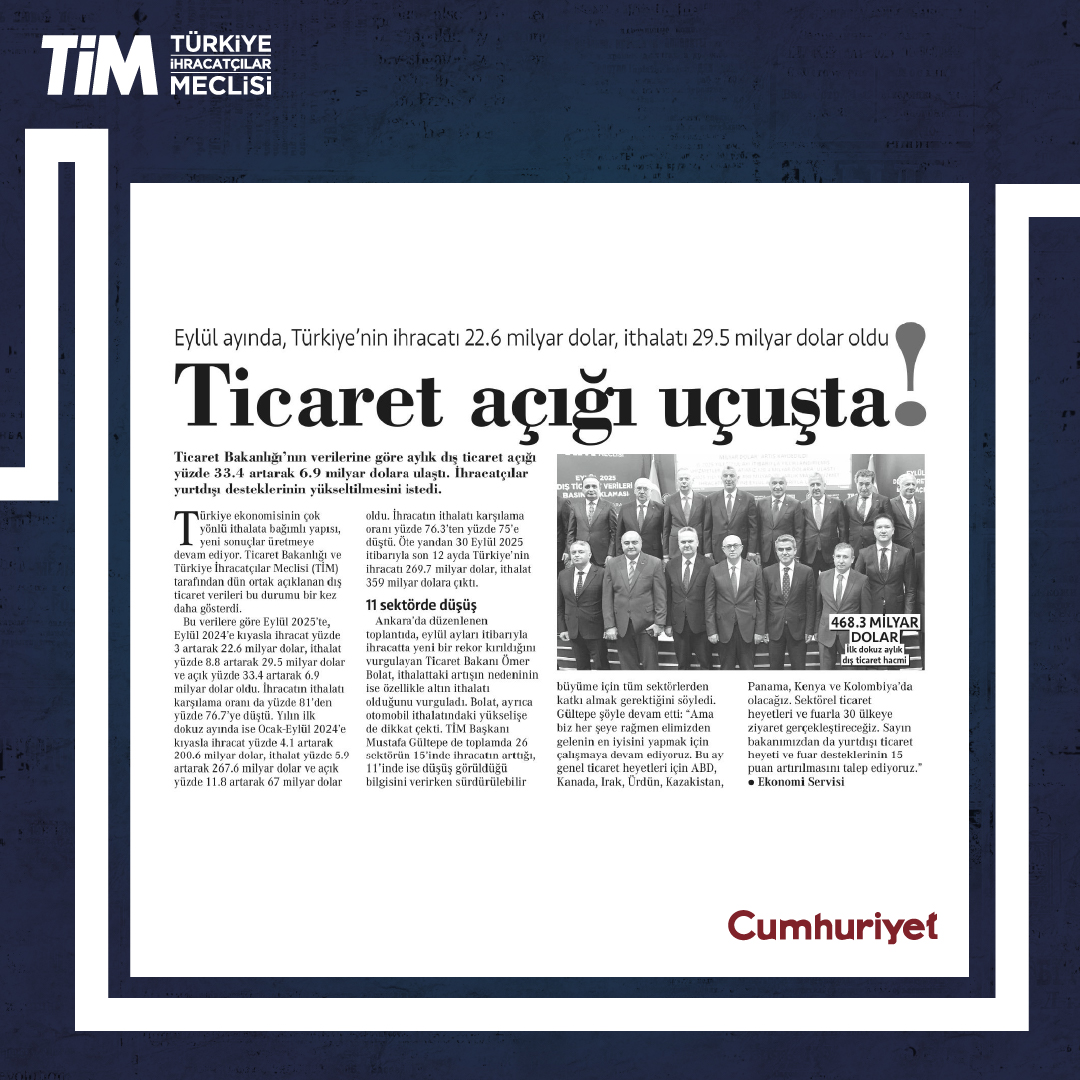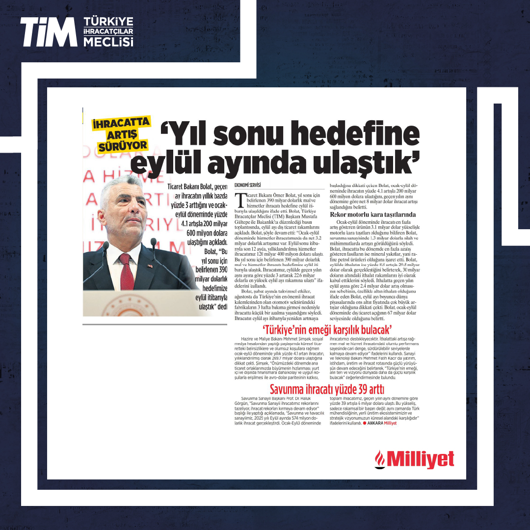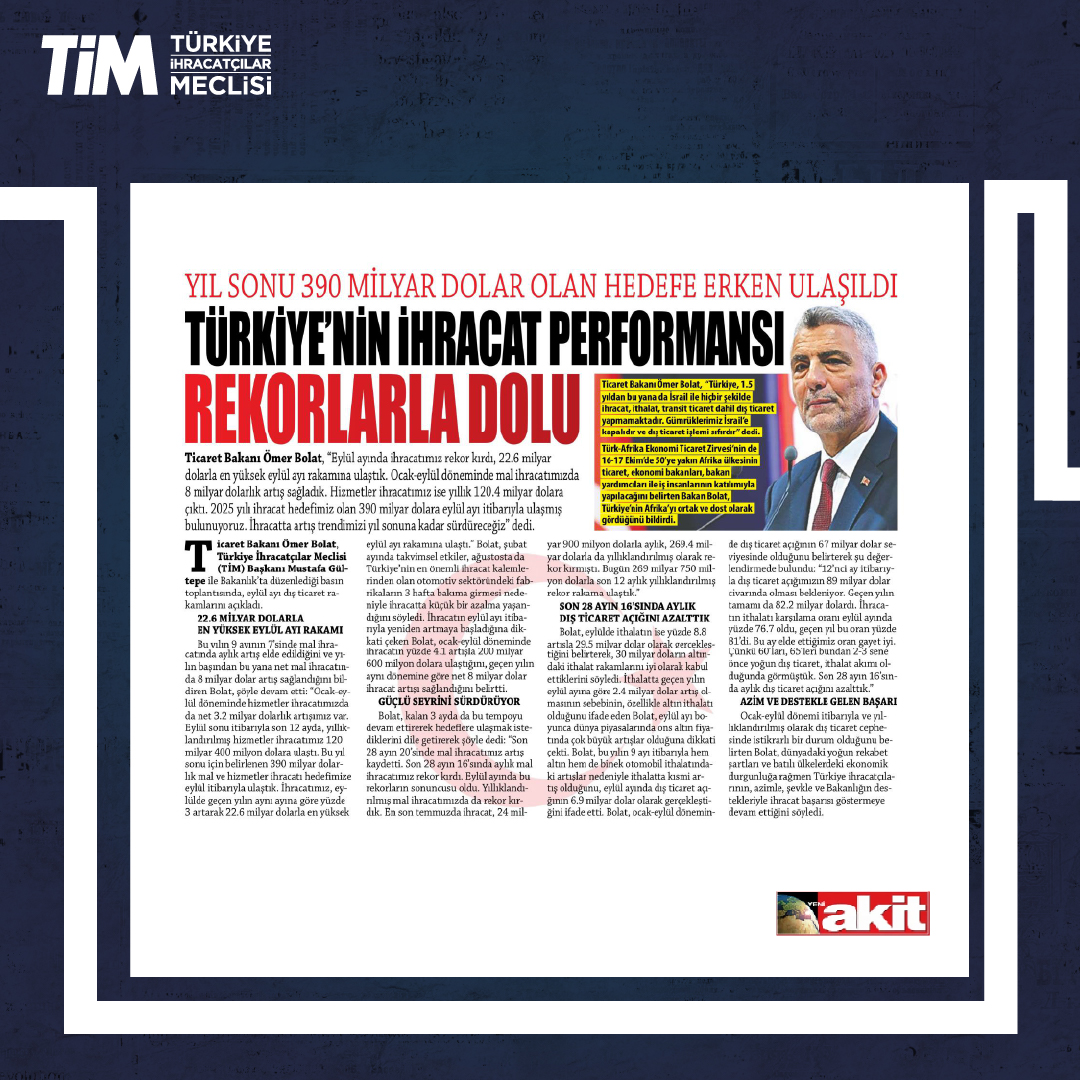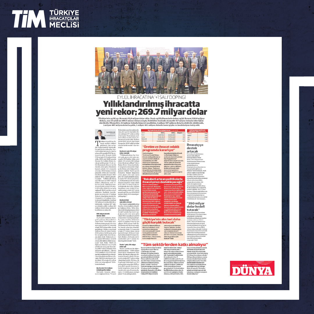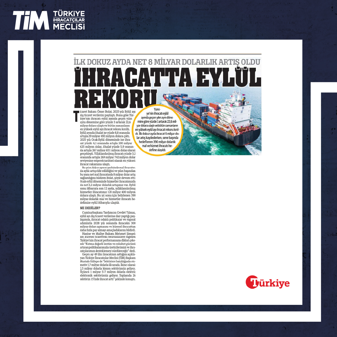 Eylül ayı ihracat verileri Ticaret Bakanı Prof. Dr. Ömer Bolat ve TİM Başkanı Mustafa Gültepe tarafından Ankara'da açıklandı. Türkiye'nin eylül ayı ihracatı 22,6 milyar dolar oldu. Ocak-Eylül döneminde dokuz aylık ihracat 200,6 milyar dolara, son 12 aylık ise 269,7 milyar dolara ulaştı. TİM Başkanı Mustafa Gültepe, ihracatı tabana yayma konusunda sıkıntıların devam ettiğine dikkat çekti. İhracatta sürdürülebilir büyüme için tüm sektörlerden katkı almak gerektiğini belirten Gültepe, “Ama biz her şeye rağmen elimizden gelenin en iyisini yapmak için çalışmaya, yeni pazar arayışına devam ediyoruz. Sektörel ticaret heyetleri ve fuarla 30 ülkeye ziyaret gerçekleştireceğiz.” dedi.