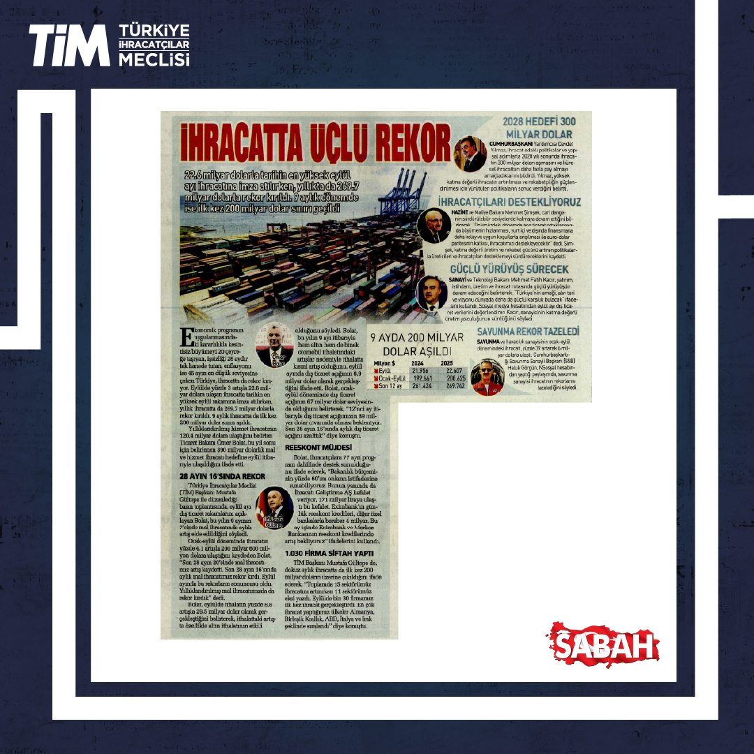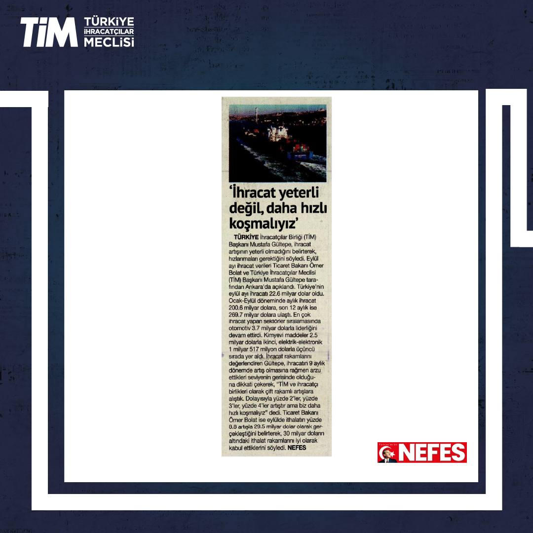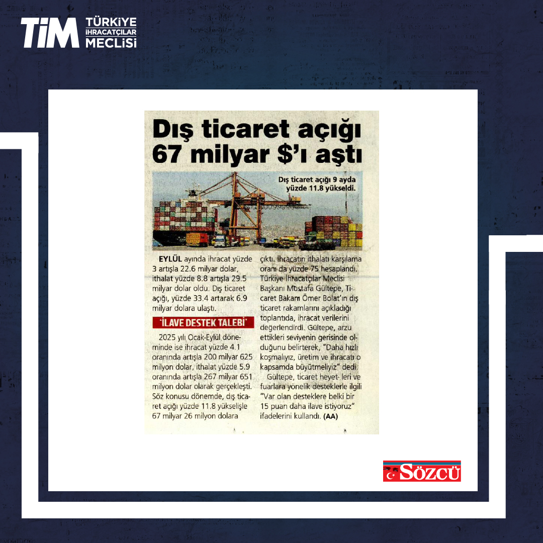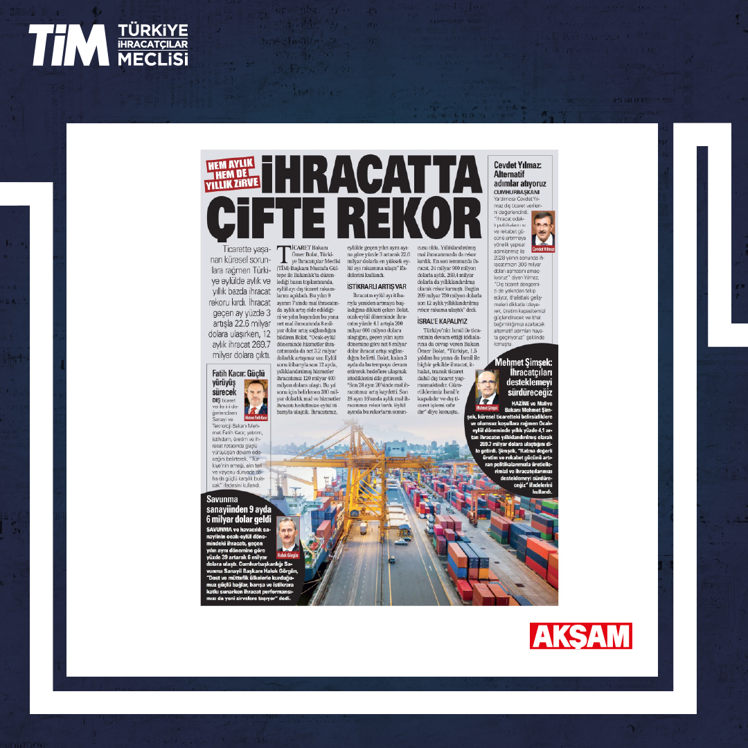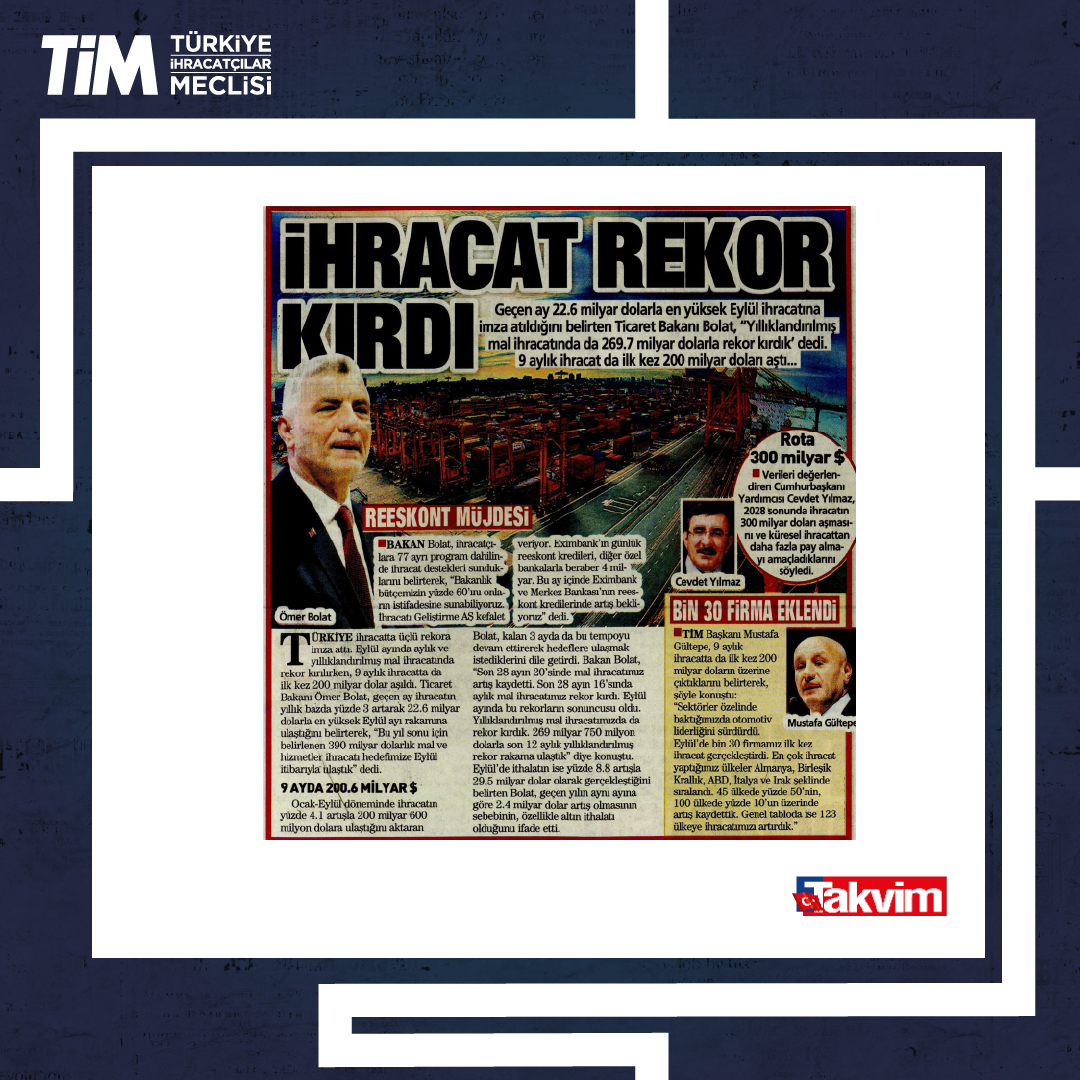 Eylül ayı ihracat verileri Ticaret Bakanı Prof. Dr. Ömer Bolat ve TİM Başkanı Mustafa Gültepe tarafından Ankara'da açıklandı. Türkiye'nin eylül ayı ihracatı 22,6 milyar dolar oldu. Ocak-Eylül döneminde dokuz aylık ihracat 200,6 milyar dolara, son 12 aylık ise 269,7 milyar dolara ulaştı. TİM Başkanı Mustafa Gültepe, ihracatı tabana yayma konusunda sıkıntıların devam ettiğine dikkat çekti. İhracatta sürdürülebilir büyüme için tüm sektörlerden katkı almak gerektiğini belirten Gültepe, “Ama biz her şeye rağmen elimizden gelenin en iyisini yapmak için çalışmaya, yeni pazar arayışına devam ediyoruz. Sektörel ticaret heyetleri ve fuarla 30 ülkeye ziyaret gerçekleştireceğiz.” dedi.