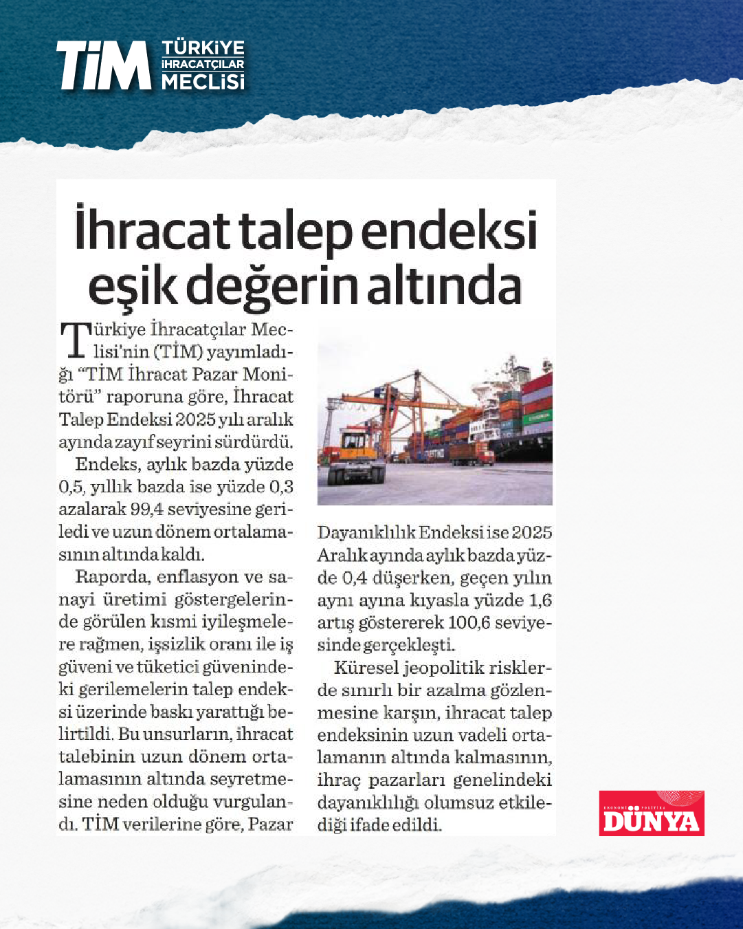 Türkiye İhracatçılar Meclisi “İhracat Pazar Monitörü” raporunu yayımladı. Yayımlanan rapora göre İhracat Talep Endeksi, aralık ayında aylık bazda yüzde 0,5, yıllık bazda ise yüzde 0,3 azalarak 99,4 seviyesine geriledi ve uzun dönem ortalamasının altında kaldı.