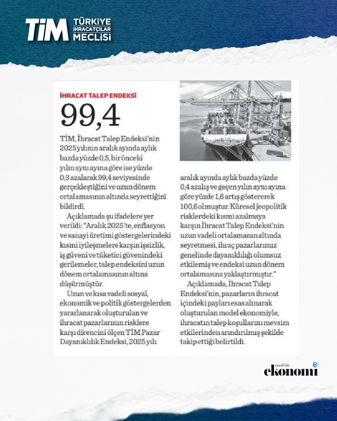 İHRACAT TALEP ENDEKSİ ARALIKTA 99,4 OLDU