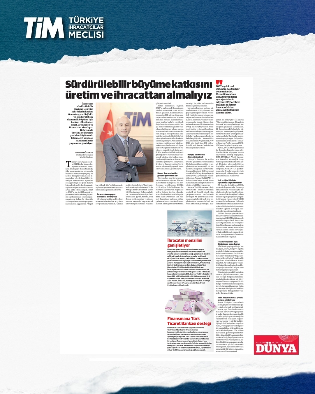 TİM Başkanı Mustafa Gültepe, ihracat gündemine ilişkin Dünya gazetesine değerlendirmelerde bulundu. Gültepe, TİM olarak cumhuriyetin ikinci yüzyılına, Türkiye'yi ihracatta ilk 10 ülke arasına çıkarma vizyonu ile başladıklarını ve bu vizyonu gerçekçi bir hedefe dönüştürebilmek için ihracatı her yıl çift haneli büyütmeleri gerektiğini ifade etti. Gültepe, “Üretimi ve ihracatı yeniden büyümenin lokomotifi yapacak hamleleri hızla hayata geçirmeliyiz.” dedi.