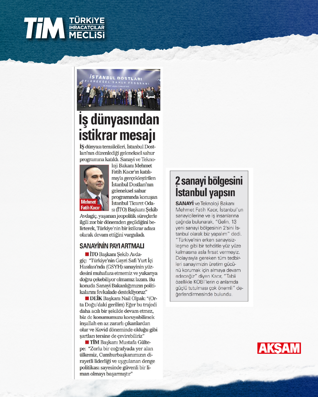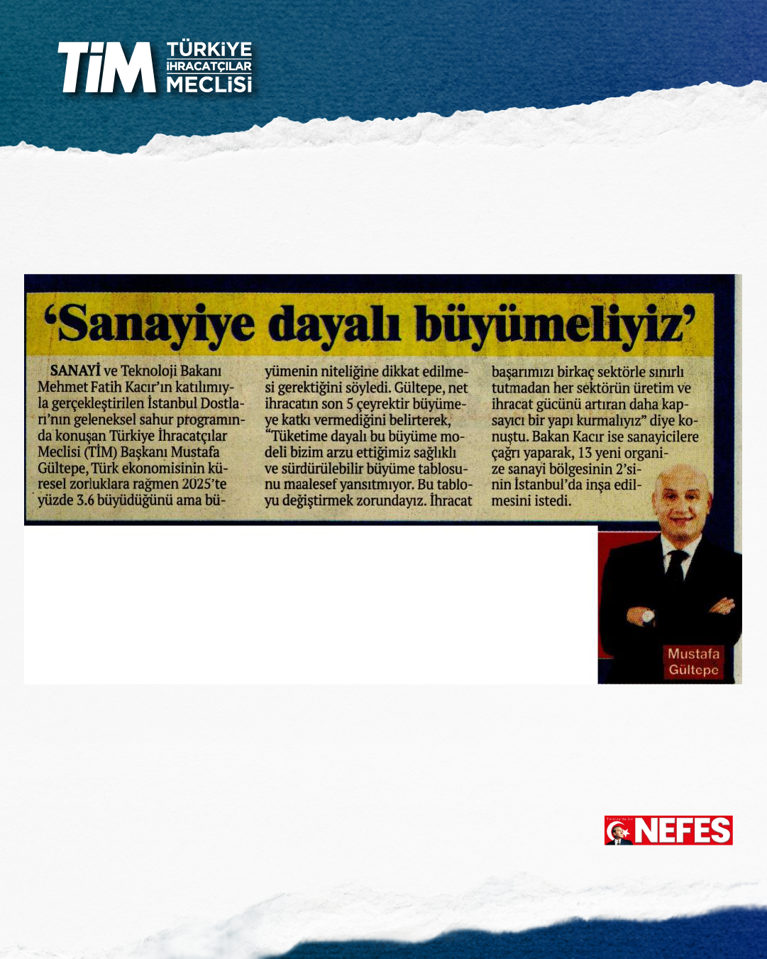 İş dünyası temsilcileri, İstanbul Dostları'nın düzenlediği geleneksel sahur programına katıldı. Sanayi ve Teknoloji Bakanı Mehmet Fatih Kacır'ın katılımıyla gerçekleştirilen programda konuşan TİM Başkanı Mustafa Gültepe, Türkiye ekonomisinin tüm küresel zorluklara rağmen 2025'te yüzde 3,6 büyüdüğünü belirtti. Verinin olumlu görünse de büyümenin niteliği konusunda dikkat edilmesi gereken önemli bir gerçeğin olduğunu dile getiren Gültepe, “İhracat başarımızı birkaç sektörle sınırlı tutmadan her sektörün üretim ve ihracat gücünü artıran daha kapsayıcı bir yapı kurmalıyız.” dedi.