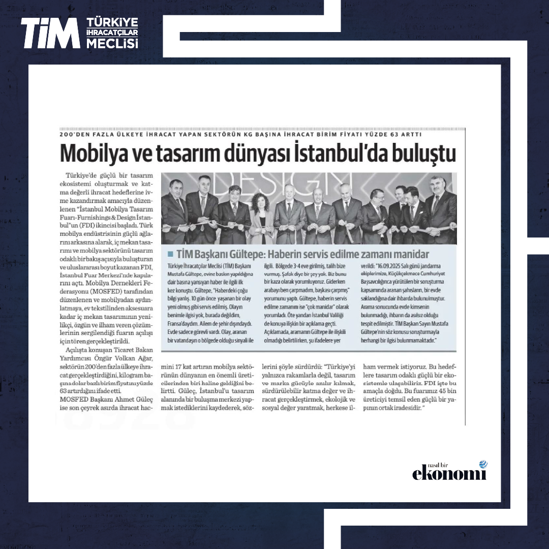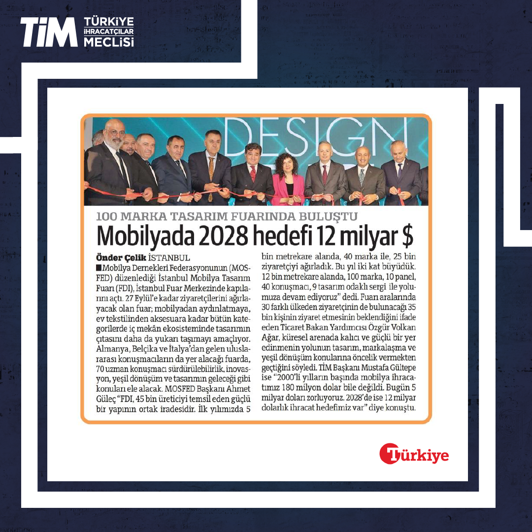 Mobilya Dernekleri Federasyonu'nun (MOSFED) düzenlendiği Furnishings & Design İstanbul (FDI), İstanbul Fuar Merkezi'nde kapılarını açtı. Fuarın açılışında konuşan TİM Başkanı Mustafa Gültepe, “2000'li yılların başında mobilya ihracatımız 180 milyon dolar bile değildi. Bugün 5 milyar doları zorluyoruz. 2028'de ise 12 milyar dolarlık ihracat hedefimiz var.” dedi.