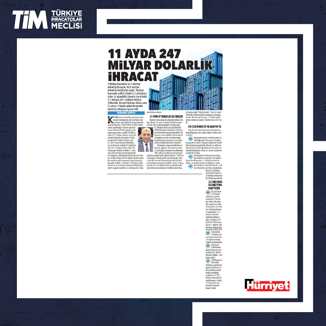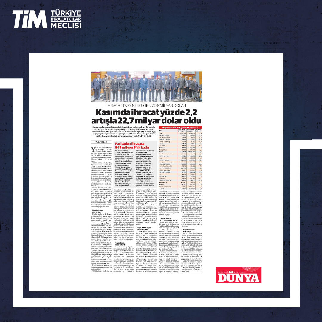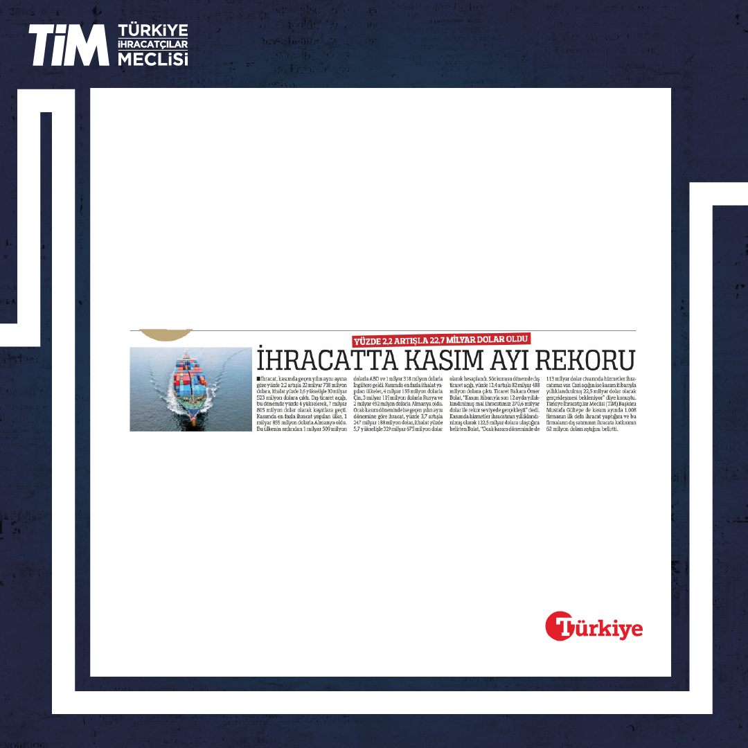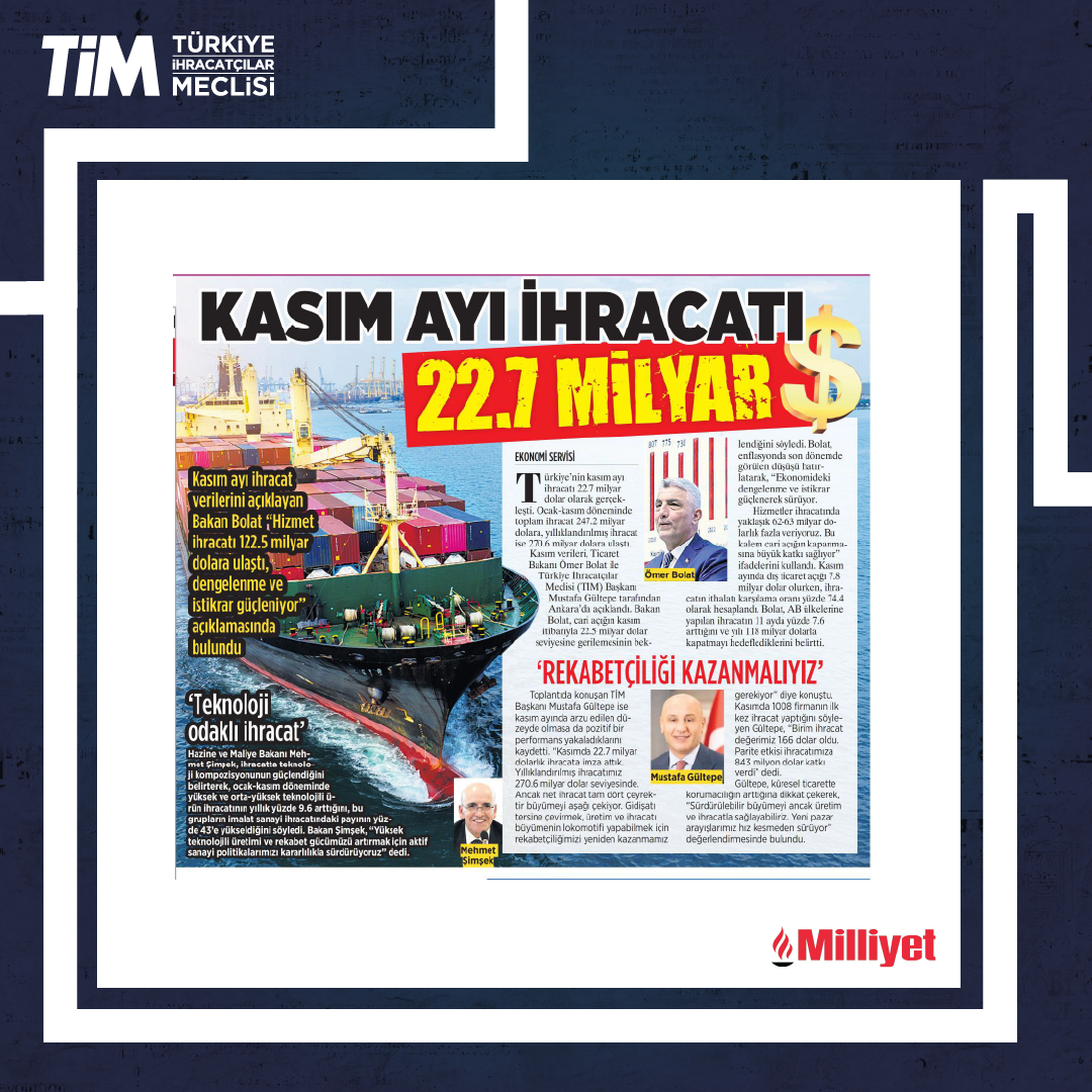 Kasım ayı ihracat verileri Ticaret Bakanı Prof. Dr. Ömer Bolat ve Türkiye İhracatçılar Meclisi (TİM) Başkanı Mustafa Gültepe tarafından Ankara'da açıklandı. Türkiye'nin kasım ayı ihracatı 22,7 milyar dolar oldu. Ocak-Kasım döneminde 11 aylık ihracat 247,2 milyar dolara, son 12 aylık ihracat ise 270,6 milyar dolara ulaştı. TİM Başkanı Mustafa Gültepe, arzu ettikleri düzeyde olmasa da kasım ayı ihracatında artış kaydettiklerini söyledi. Gültepe, “Gidişatı tersine çevirmek, üretim ve ihracatı büyümenin lokomotifi yapabilmek için rekabetçiliğimizi yeniden kazanmamız gerekiyor.” dedi.