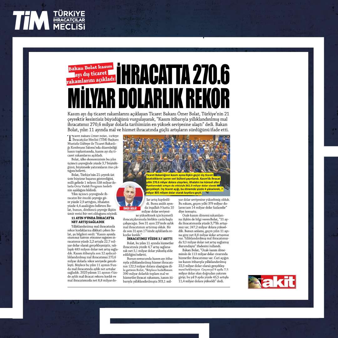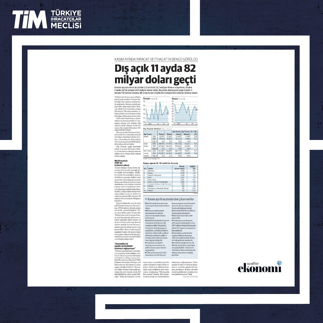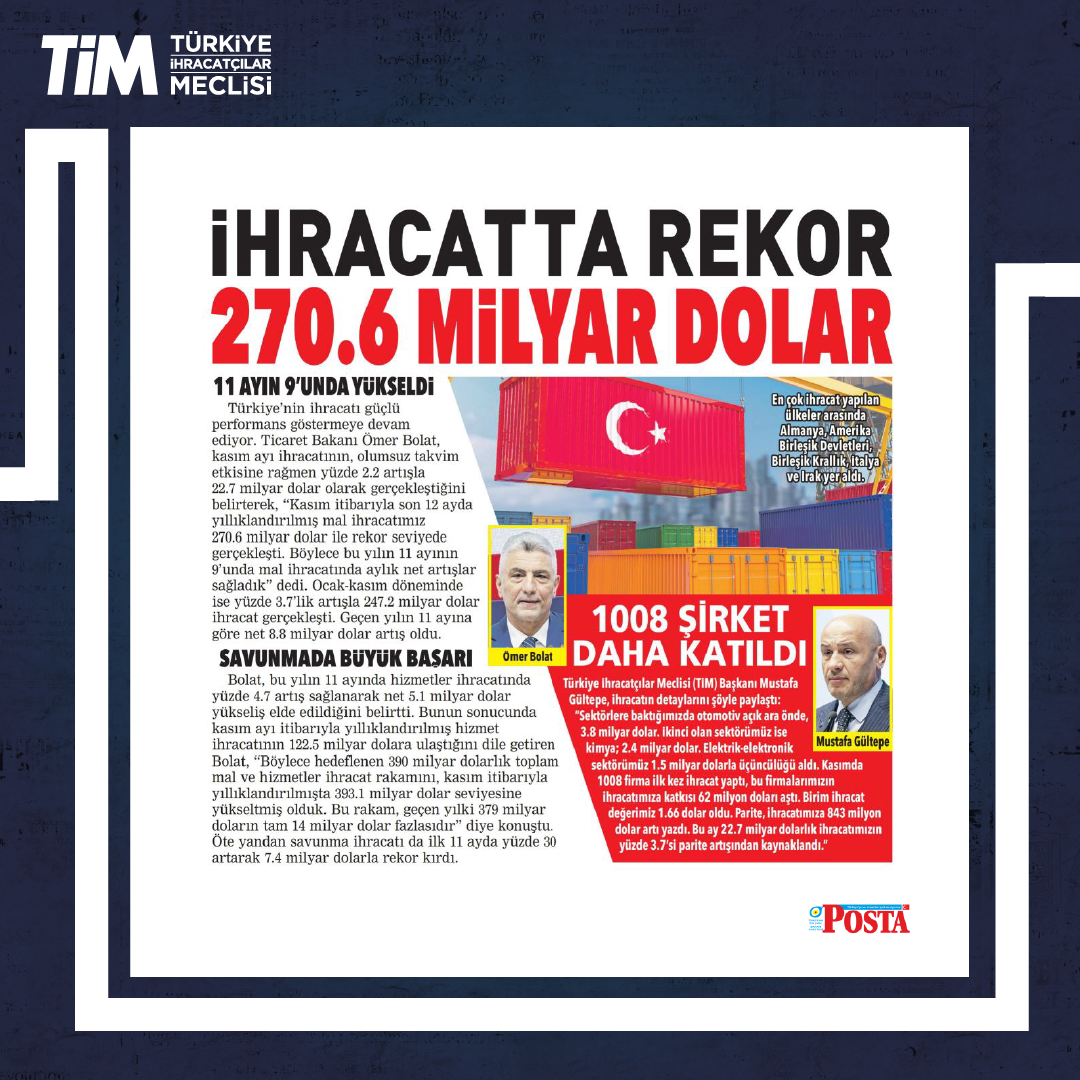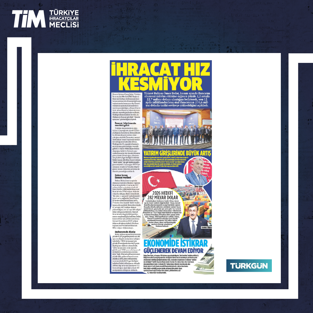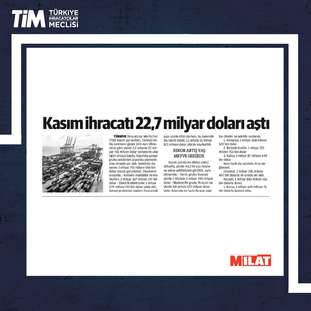 Kasım ayı ihracat verileri Ticaret Bakanı Prof. Dr. Ömer Bolat ve Türkiye İhracatçılar Meclisi (TİM) Başkanı Mustafa Gültepe tarafından Ankara'da açıklandı. Türkiye'nin kasım ayı ihracatı 22,7 milyar dolar oldu. Ocak-Kasım döneminde 11 aylık ihracat 247,2 milyar dolara, son 12 aylık ihracat ise 270,6 milyar dolara ulaştı. TİM Başkanı Mustafa Gültepe, arzu ettikleri düzeyde olmasa da kasım ayı ihracatında artış kaydettiklerini söyledi. Gültepe, “Gidişatı tersine çevirmek, üretim ve ihracatı büyümenin lokomotifi yapabilmek için rekabetçiliğimizi yeniden kazanmamız gerekiyor.” dedi.