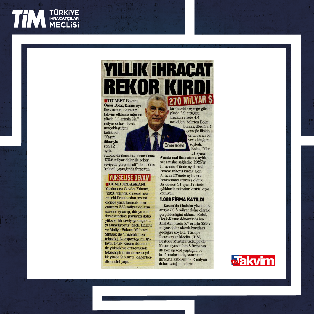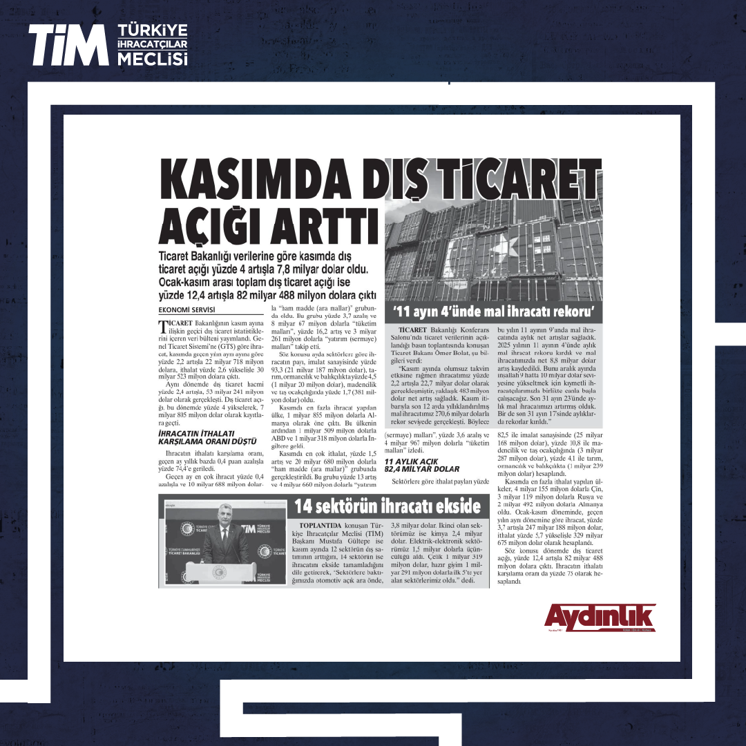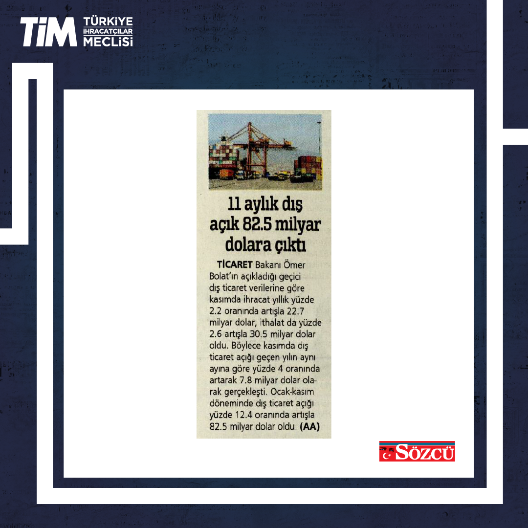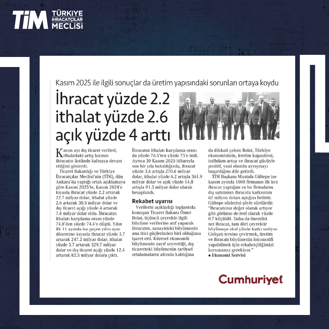 Kasım ayı ihracat verileri Ticaret Bakanı Prof. Dr. Ömer Bolat ve Türkiye İhracatçılar Meclisi (TİM) Başkanı Mustafa Gültepe tarafından Ankara'da açıklandı. Türkiye'nin kasım ayı ihracatı 22,7 milyar dolar oldu. Ocak-Kasım döneminde 11 aylık ihracat 247,2 milyar dolara, son 12 aylık ihracat ise 270,6 milyar dolara ulaştı. TİM Başkanı Mustafa Gültepe, arzu ettikleri düzeyde olmasa da kasım ayı ihracatında artış kaydettiklerini söyledi. Gültepe, “Gidişatı tersine çevirmek, üretim ve ihracatı büyümenin lokomotifi yapabilmek için rekabetçiliğimizi yeniden kazanmamız gerekiyor.” dedi.