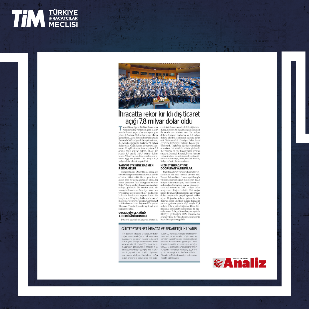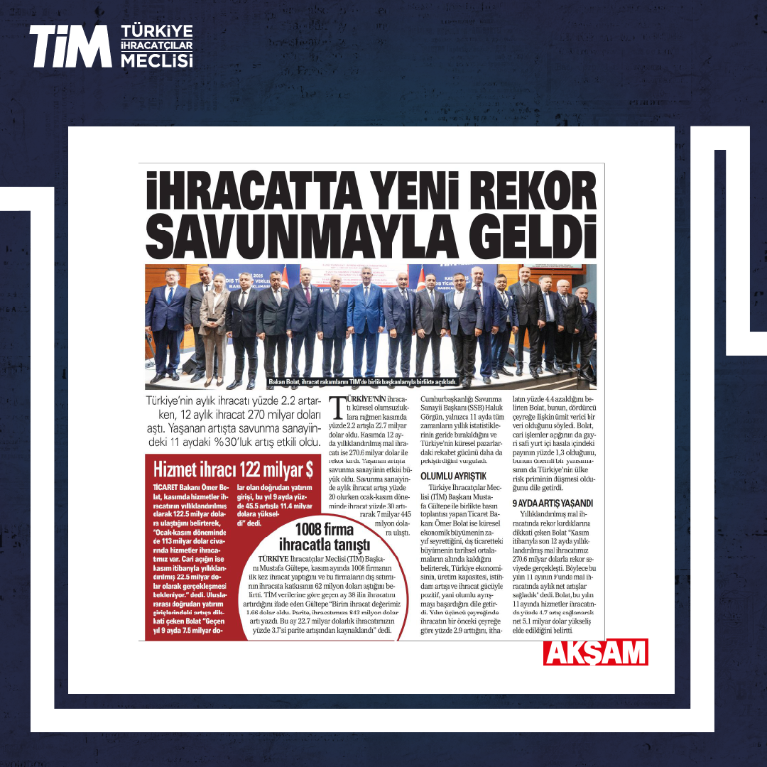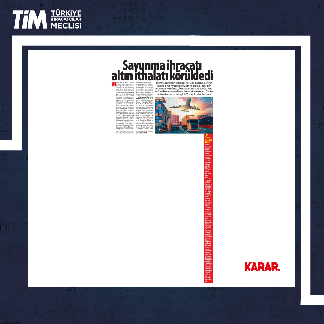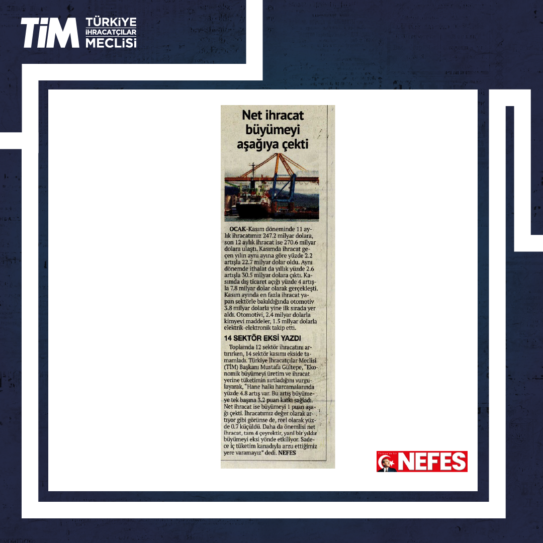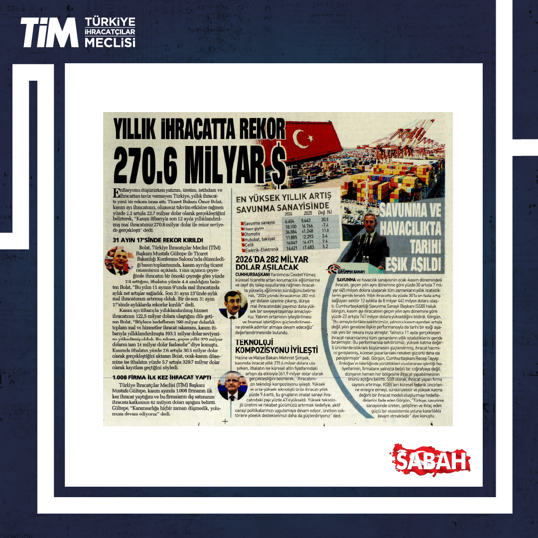 Kasım ayı ihracat verileri Ticaret Bakanı Prof. Dr. Ömer Bolat ve Türkiye İhracatçılar Meclisi (TİM) Başkanı Mustafa Gültepe tarafından Ankara'da açıklandı. Türkiye'nin kasım ayı ihracatı 22,7 milyar dolar oldu. Ocak-Kasım döneminde 11 aylık ihracat 247,2 milyar dolara, son 12 aylık ihracat ise 270,6 milyar dolara ulaştı. TİM Başkanı Mustafa Gültepe, arzu ettikleri düzeyde olmasa da kasım ayı ihracatında artış kaydettiklerini söyledi. Gültepe, “Gidişatı tersine çevirmek, üretim ve ihracatı büyümenin lokomotifi yapabilmek için rekabetçiliğimizi yeniden kazanmamız gerekiyor.” dedi.