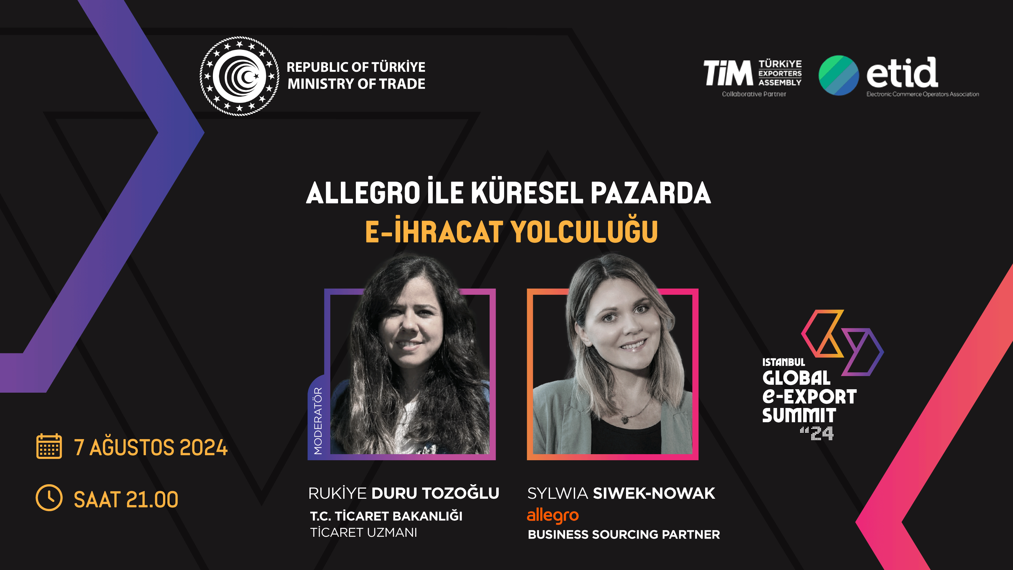 Bu doğrultuda, Allegro ile Küresel Pazarda E-İhracat Yolculuğu Webinarı, Allegro İş Tedarik Ortağı Sylwia Siwek-Nowak'ın katılımlarıyla 7 Ağustos 2024 Çarşamba günü gerçekleştirilecektir. Webinara katılmak isteyen kamu ve özel sektör kuruluşlarının 7 Ağustos 2024 Çarşamba günü saat 20.00'a kadar kayıt olmaları gerekmektedir.