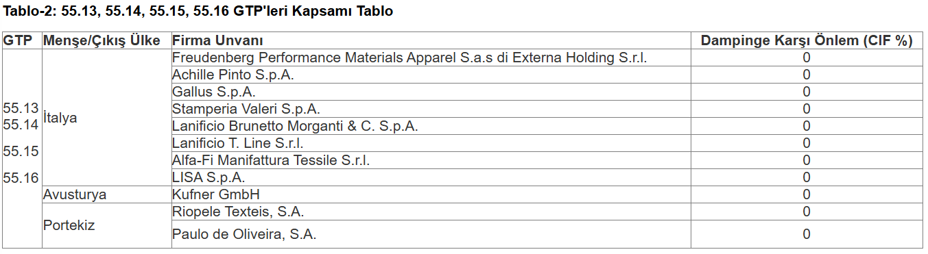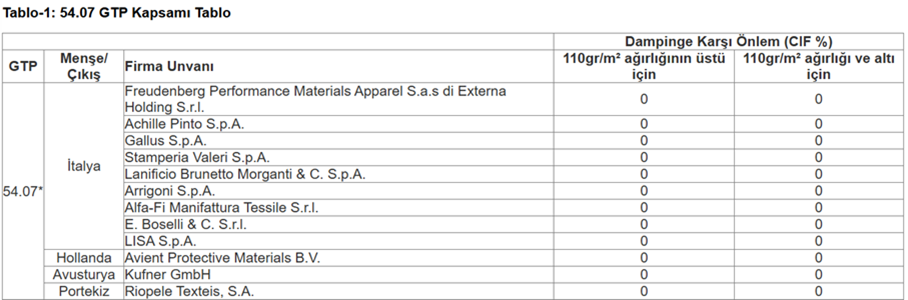 İthalatta Haksız Rekabetin Önlenmesine İlişkin Tebliğ (Tebliğ No: 2024/29) ile İtalya, Hollanda, Avusturya ve Portekiz menşeli/çıkışlı 54.07 GTP kapsamındaki sentetik filament iplikten dokunmuş (giyim için olan) mensucat ile İtalya, Avusturya ve Portekiz menşeli/çıkışlı 55.13, 55.14, 55.15 ve 55.16 GTP kapsamındaki sentetik veya suni devamsız liflerden dokunmuş mensucat ithalatına yönelik dampinge karşı vergi uygulamasından bazı firmalar muaf tutuldu.