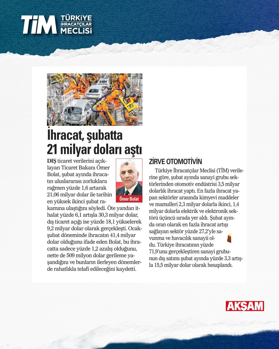 ŞUBAT AYI İHRACATI 21 MİLYAR 65 MİLYON DOLAR OLDU
