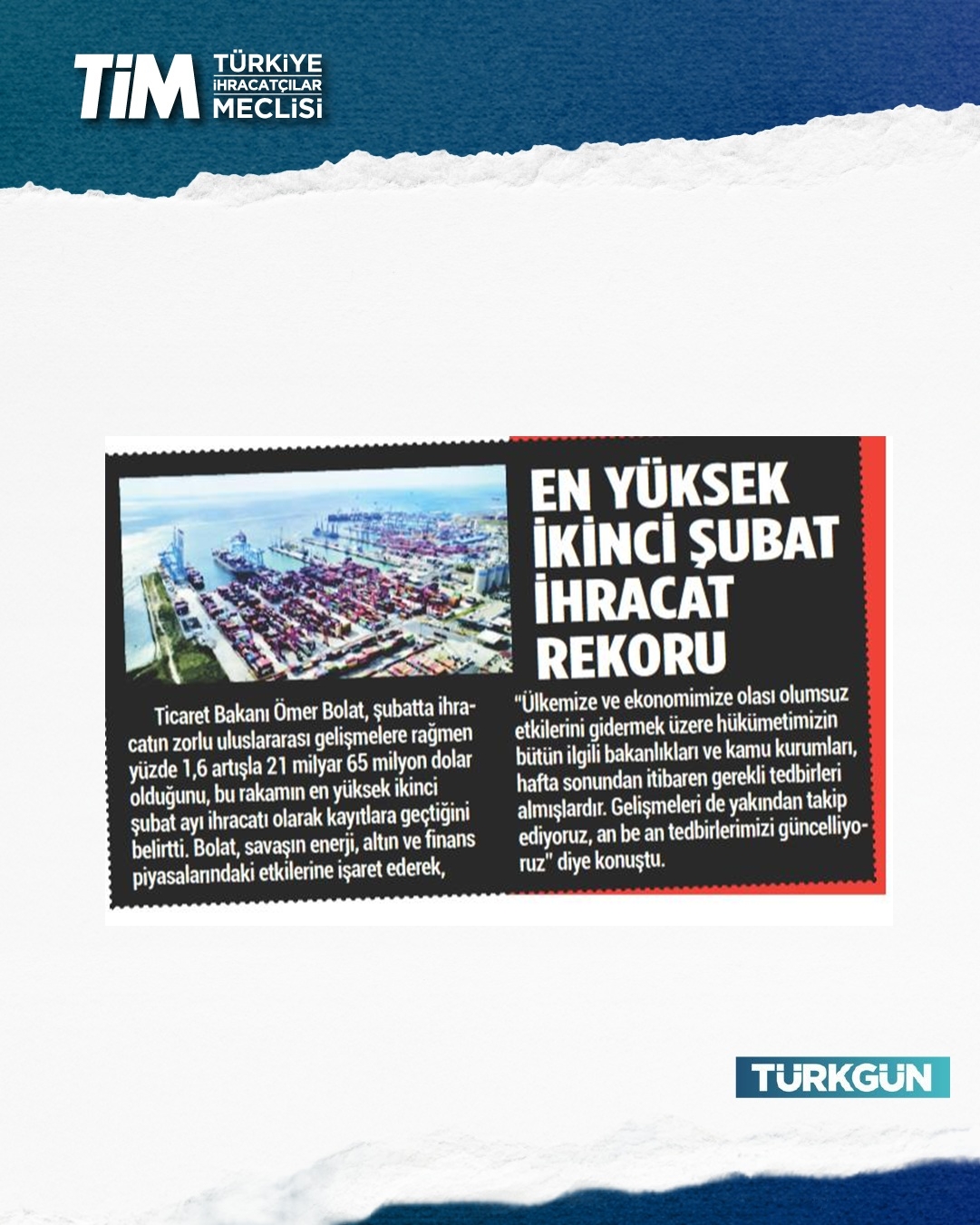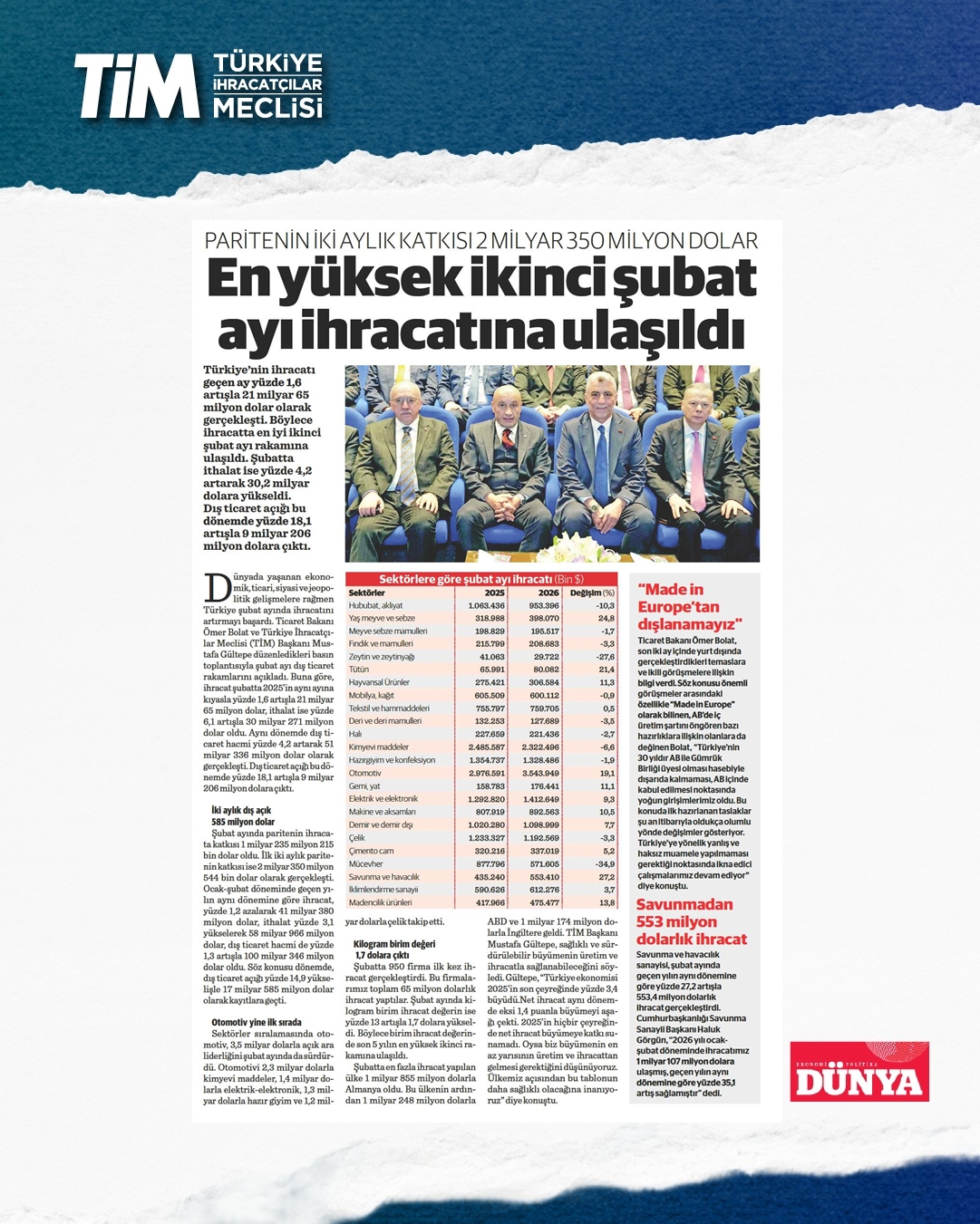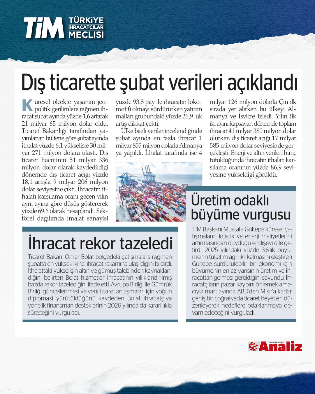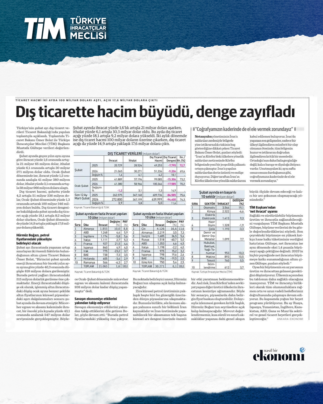 Türkiye'nin şubat ayı ihracatı yüzde 1,6 artışla 21 milyar dolar 65 milyon dolar oldu. Ocak-şubat döneminde iki aylık ihracat 41,4, son 12 aylık ihracat ise 272,8 milyar dolar düzeyinde gerçekleşti. TİM Başkanı Mustafa Gültepe, konuşmasında sağlıklı ve sürdürülebilir büyümenin üretim ve ihracatla sağlanabileceği yönündeki görüşünü yineledi. Açıklanan büyüme verilerini bu gözle değerlendirdiklerini belirten Gültepe, “2025'in hiçbir çeyreğinde net ihracat büyümeye katkı sunamadı. Oysa biz büyümenin en az yarısının üretim ve ihracattan gelmesi gerektiğini düşünüyoruz.” dedi.