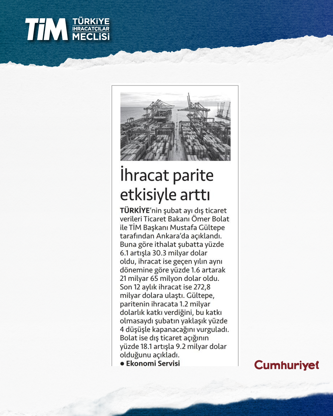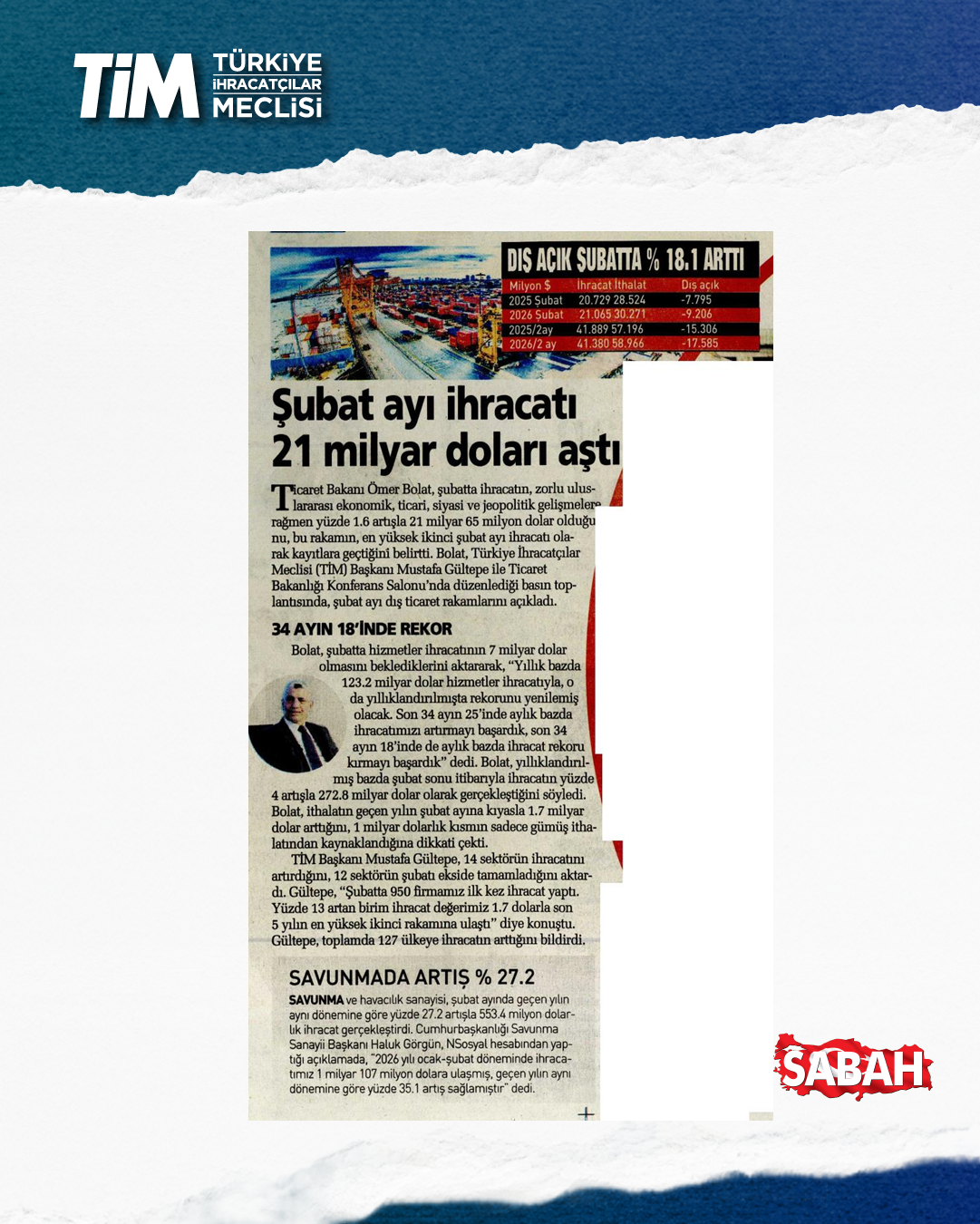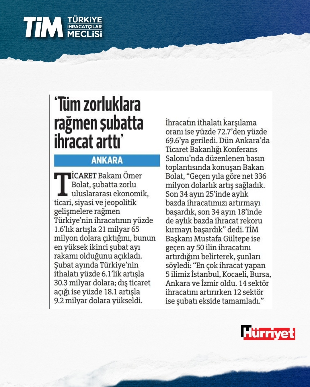 Türkiye'nin şubat ayı ihracatı yüzde 1,6 artışla 21 milyar dolar 65 milyon dolar oldu. Ocak-şubat döneminde iki aylık ihracat 41,4, son 12 aylık ihracat ise 272,8 milyar dolar düzeyinde gerçekleşti. TİM Başkanı Mustafa Gültepe, konuşmasında sağlıklı ve sürdürülebilir büyümenin üretim ve ihracatla sağlanabileceği yönündeki görüşünü yineledi. Açıklanan büyüme verilerini bu gözle değerlendirdiklerini belirten Gültepe, “2025'in hiçbir çeyreğinde net ihracat büyümeye katkı sunamadı. Oysa biz büyümenin en az yarısının üretim ve ihracattan gelmesi gerektiğini düşünüyoruz.” dedi.