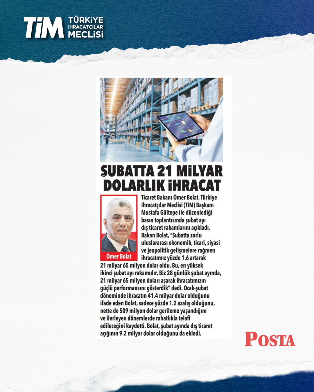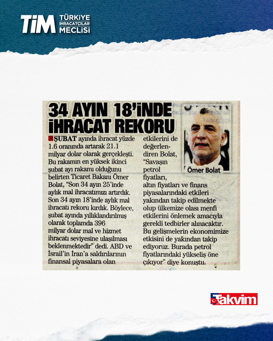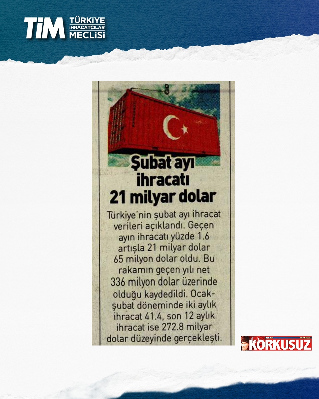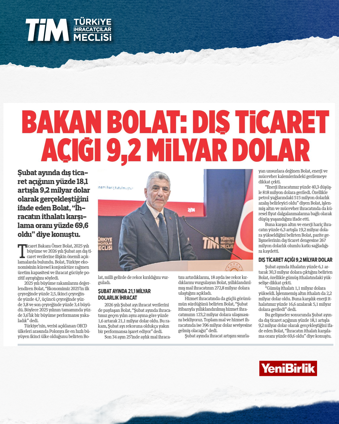 Türkiye'nin şubat ayı ihracatı yüzde 1,6 artışla 21 milyar dolar 65 milyon dolar oldu. Ocak-şubat döneminde iki aylık ihracat 41,4, son 12 aylık ihracat ise 272,8 milyar dolar düzeyinde gerçekleşti. TİM Başkanı Mustafa Gültepe, konuşmasında sağlıklı ve sürdürülebilir büyümenin üretim ve ihracatla sağlanabileceği yönündeki görüşünü yineledi. Açıklanan büyüme verilerini bu gözle değerlendirdiklerini belirten Gültepe, “2025'in hiçbir çeyreğinde net ihracat büyümeye katkı sunamadı. Oysa biz büyümenin en az yarısının üretim ve ihracattan gelmesi gerektiğini düşünüyoruz.” dedi.
