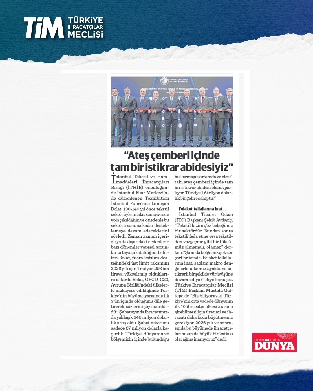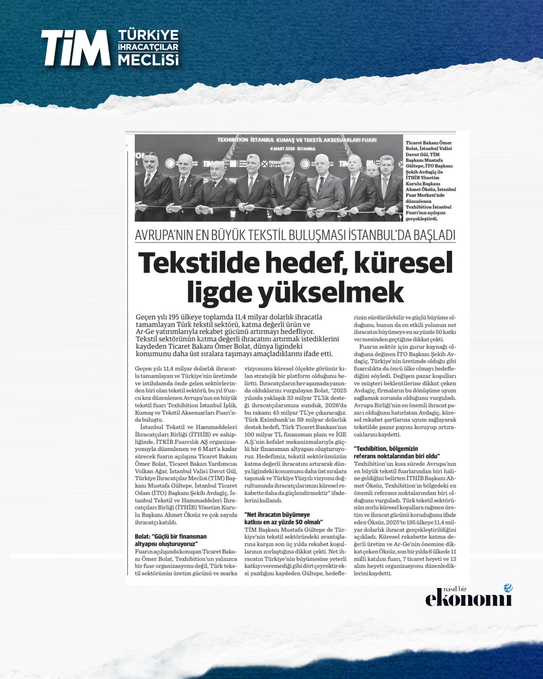 İTHİB tarafından düzenlenen Avrupa'nın en büyük tekstil fuarı “Texhibition İstanbul İplik, Kumaş ve Tekstil Aksesuarları Fuarı” 9'uncu kez kapılarını açtı. Fuarın açılışında konuşan TİM Başkanı Mustafa Gültepe, Texhibition'ın tekstil sektöründeki önemine dikkat çekerek, organizasyonun sektörün küresel marka değerini yükselten en önemli vitrinlerden birisi olduğunu söyledi. Gültepe, “İstişareyle, ortak akılla, cesaretle hep beraber böyle bir fuarı ortaya koyduk. Anadolu'yu üretim üssü, İstanbul'u da moda merkezi haline getireceğiz.” dedi.