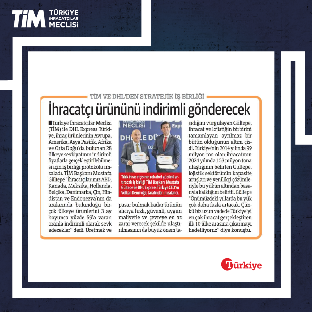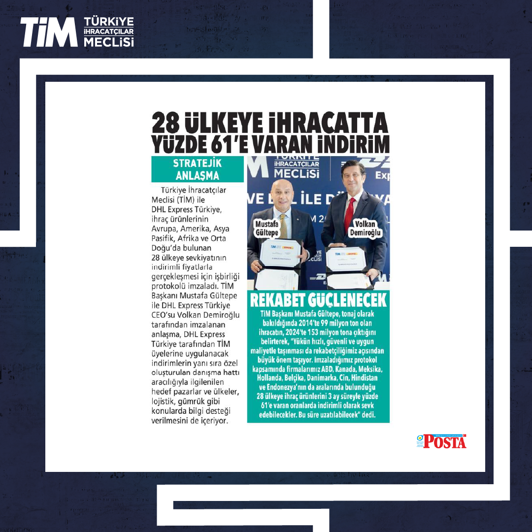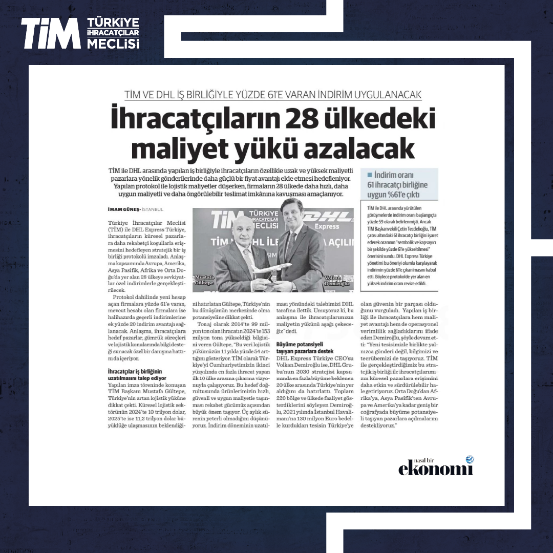 Türkiye İhracatçılar Meclisi (TİM) ile DHL Express Türkiye, ihraç ürünlerinin Avrupa, Amerika, Asya Pasifik, Afrika ve Orta Doğu'da bulunan 28 ülkeye sevkiyatının indirimli fiyatlarla gerçekleştirebilmesi için iş birliği protokolü imzaladı. TİM Başkanı Mustafa Gültepe imza töreninde yaptığı konuşmada ihracat ve lojistiğin birbirini tamamlayan ayrılmaz bir bütün olduğunun altını çizdi. Gültepe, “DHL Express Türkiye ile de çok anlamlı bir iş birliğini başlatmış bulunuyoruz. İmzaladığımız protokol kapsamında firmalarımız 28 ülkeye ihraç ürünlerini 3 ay süreyle yüzde 61'e varan oranlarda indirimli olarak sevk edebilecekler.” dedi.