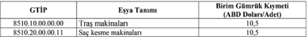 Buna göre, söz konusu makinelerin ithalatında birim gümrük kıymeti, adet başına 10,5 dolar olacak.