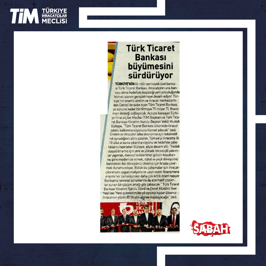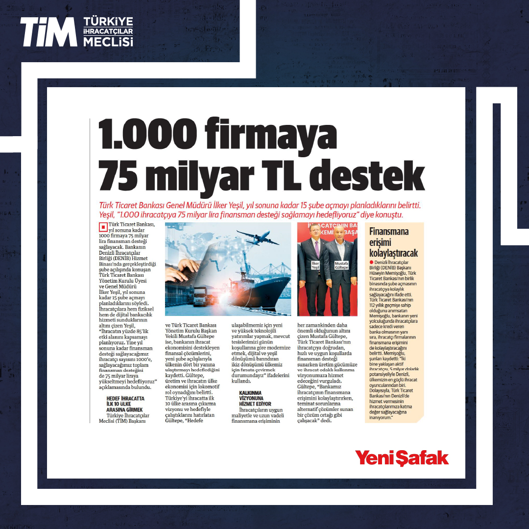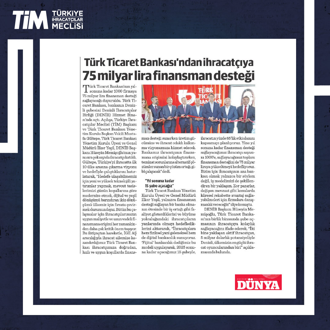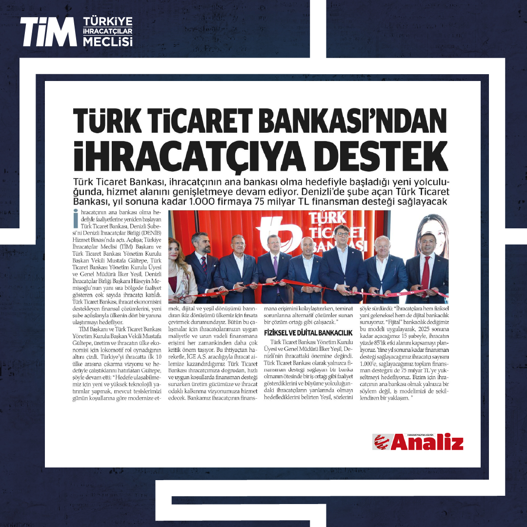 Türk Ticaret Bankası, ihracatçının ana bankası olma hedefiyle başladığı yeni yolculuğunda, hizmet alanını genişletmeye devam ediyor. Denizli'de şube açan Türk Ticaret Bankası, yıl sonuna kadar 1.000 firmaya 75 milyar TL finansman desteği sağlayacak. DENİB Hizmet Binası'ndaki TTB Denizli Şube açılışında konuşan TİM Başkanı Mustafa Gültepe, “Türk Ticaret Bankası ihracatçımıza doğrudan, hızlı ve uygun koşullarda finansman desteği sunarken üretim gücümüze ve ihracat odaklı kalkınma vizyonumuza hizmet edecek.” dedi.